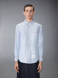 DETAILS & FIT A Thom Browne essential, our Oxford Grosgrain Framing Shirt exhibits quality craftsmanship and meticulous tailoring. Pair it with one of our signature trousers. Front button closure Patch chest pocket Name tag applique above hem Pleated back yoke with locker loop Signature striped grosgrain loop tab Model is 6' 1" (185cm), wearing size 1 100% Cotton Made in ITALY MWL406A-F0313-480