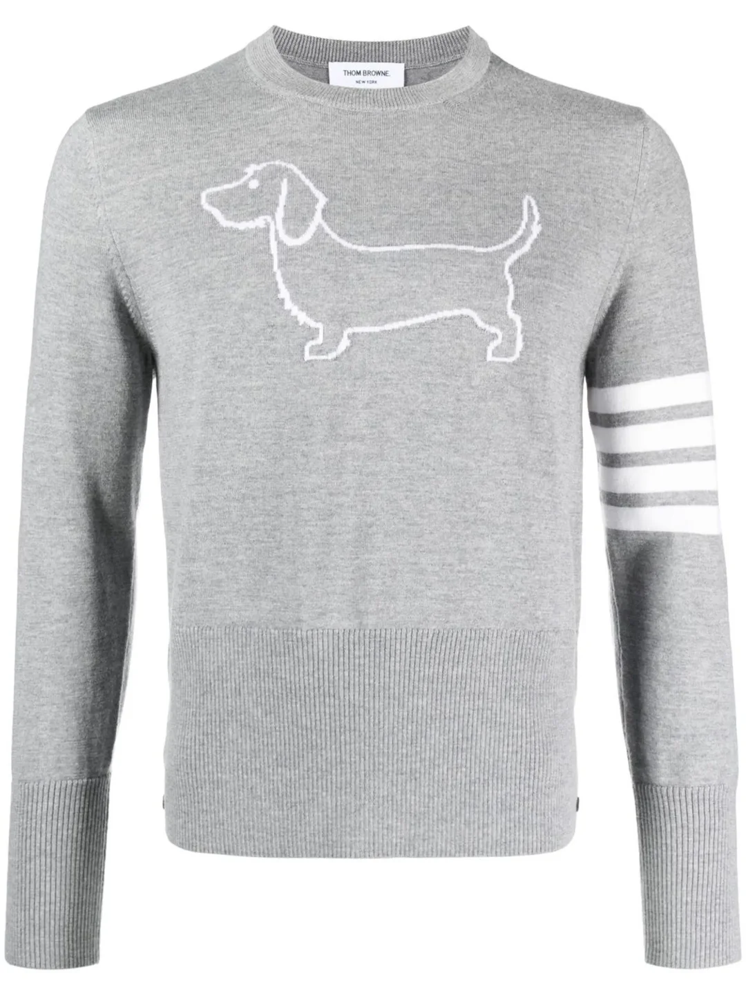 Thom Browne Hector Icon Intarsia Pullover delivers signature preppy luxury with iconic dachshund motif craftsmanship. Crafted from premium knitted wool in classic light gray melange, featuring the brand's beloved Hector dog silhouette in white intarsia technique. The signature four-bar stripe detail on the sleeve and ribbed construction create timeless American sportswear sophistication.