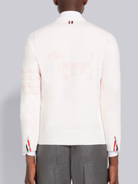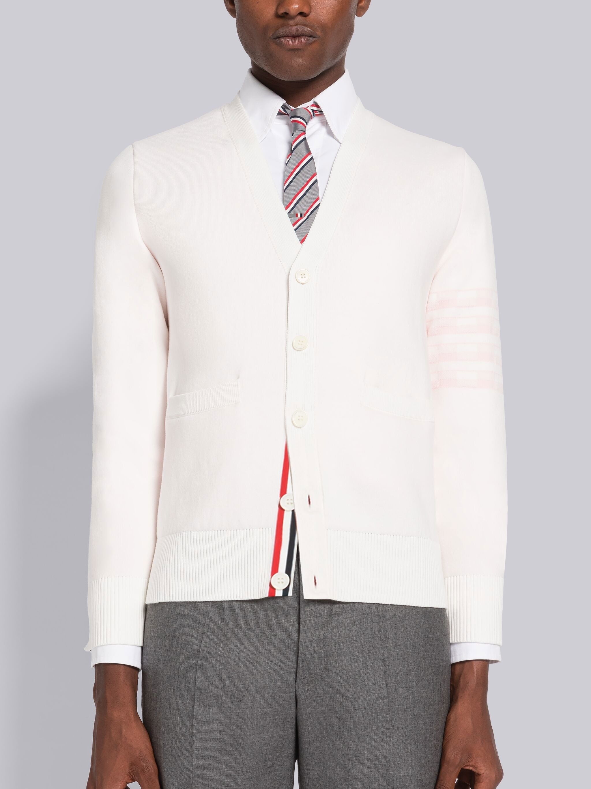 DETAILS & FIT V-neck cardigan in white cotton with Hector jacquard at back and 4-bar stripe detail at left sleeve in light pink. Front button closure with striped grosgrain placket. Buttoned cuffs with signature striped grosgrain trim. Signature striped grosgrain loop tab at back of neck. Model is 6' 1" (185cm), wearing size 1. 95%Cotton, 4%Polyamide, 1%Elastane Made in Italy MKC469AY3006100