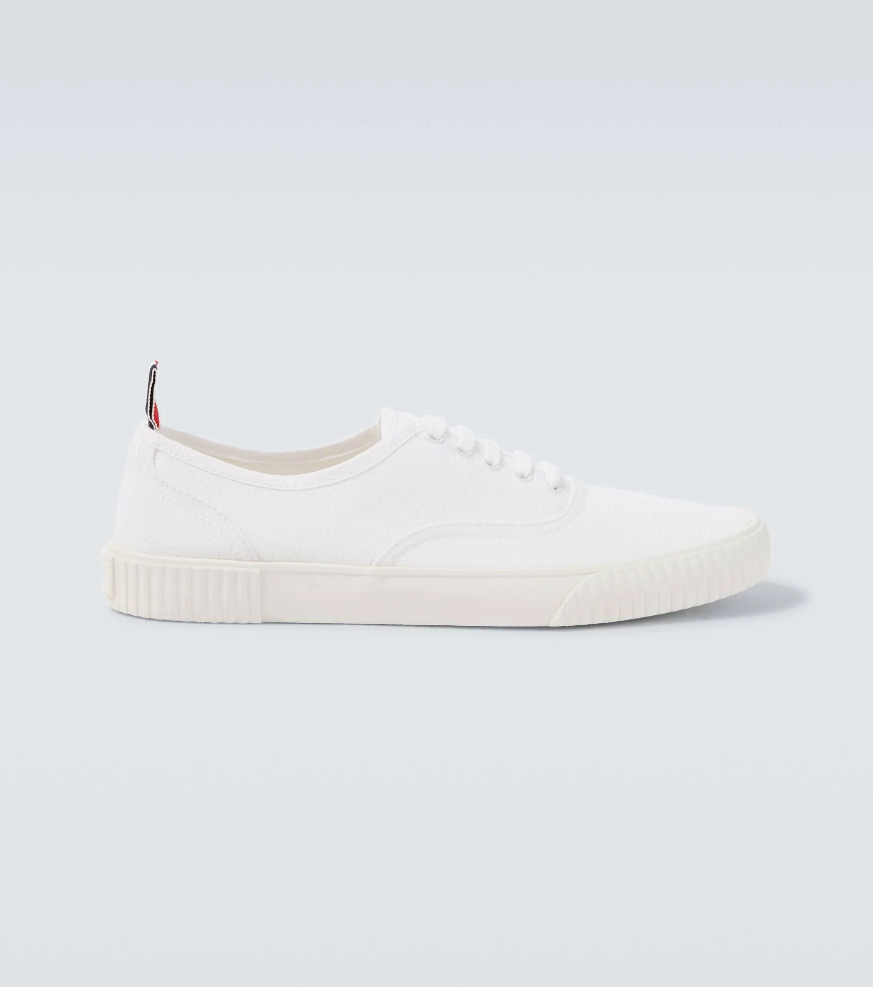 Thom Browne has gained global attention for redefining contemporary tailoring and creating a modern uniform. Made in Spain from white canvas, the Heritage sneakers are inspired by the designer's love for sports. Product Details - Upper: fabric - Lining: fabric - Sole: fabric insole, rubber sole - Toe shape: round toe - Made in Spain - Includes: dust bag, extra laces, shoe box - Designer color name: White - Item color: white - Closure: lace-up - Item number: P01119575