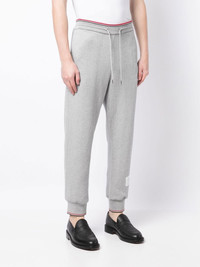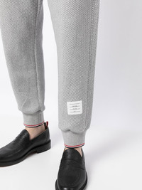 herringbone-pattern logo-patch track pants Designed for AW22, Thom Browne continues to utilize classic influences in his signature clothing. This pair of relaxed track pants are patterned with an all-over herringbone motif and detailed with the brand's distinctive RWB logo stripe. Made in Italy Composition Body: Cotton 100% SIZE & FIT Model measurements Height 6 ft 2 in(1.87 m) Bust/Chest 36.22 in(92 cm) Hips 37.79 in(96 cm) Waist 28.34 in(72 cm) FittingInformation This piece fits true to size. We recommend you get your regular size Designed to be loose over the leg with a fitted waist and hem Made with a mid-weight fabric Washing instructions Dry Clean Only