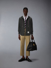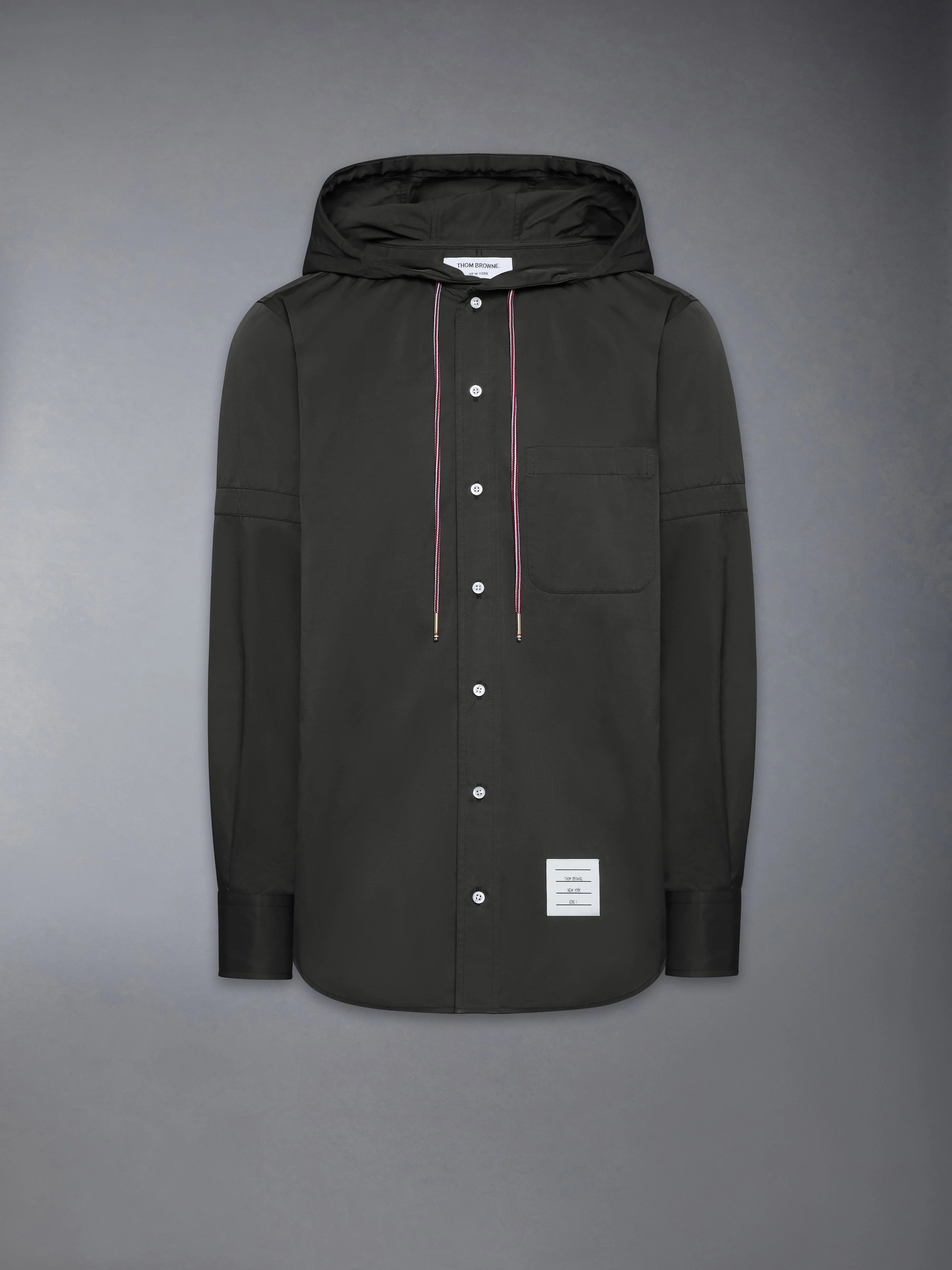 This shirt is cut in a medium-weight technical fabric with a smooth cotton face and nylon twill back, offering structure with a crisp, water-repellent finish. A shaped hood and drawcord detail replace the classic collar, introducing utility to a tailored form. Finished with signature armbands and RWB detailing, it speaks to Thom Browne’s evolving uniform language. Front button closure Shaped hood with tricolor drawstring and RWB-detailed aglets Patch chest pocket Button-fastening self armbands Buttoned cuffs with RWB grosgrain trim Pleated back yoke with locker loop Curved stepped hem Name tag applique Signature striped grosgrain loop tab Straight fit Model is 6'1" (185cm), wearing size 1 51% Polyamide, 49% Cotton Made in Italy MWL432O-F1066-001