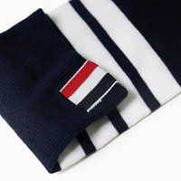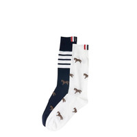 300051024NVY-NS / E6MAS212F-Y3012/00/979 - Premium cotton blend construction - Signature tricolor striped cuff - All-over horse pattern - Mid-calf height - Ribbed cuff with logo tab - Reinforced heel and toe - Available in navy and white Thom Browne Horse Pattern Mid Calf Socks deliver sophisticated playfulness with signature striped detailing and whimsical horse motifs. Crafted from premium cotton blend in classic navy and white colorways, featuring the brand's iconic red, white, and blue striped cuff. The mid-calf height and equestrian-inspired pattern create a refined statement piece that elevates formal and casual wardrobes.