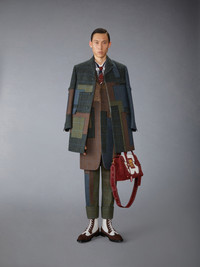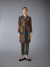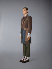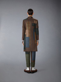 A collage of heritage hunting tweeds forms a rich landscape in warm, earthy tones inspired by the season. Hunting tweed has long been a symbol of refined tradition and functional elegance, beloved by aristocrats and countryside adventurers. Today, it is a marker of sartorial excellence—celebrated for its luxury and enduring legacy. This garment stands at the convergence of heritage and innovation in proper Thom Browne form. Front button closure 2 Front flap pockets Single chest pocket Buttoned armbands Buttoned cuffs with signature striped grosgrain trim Interior pocket with name tag Signature striped grosgrain loop tab Model is 6'1" (185cm), wearing size 1 100% Wool Lining: 100% Cupro Made in Italy MJR121E-E1414-996