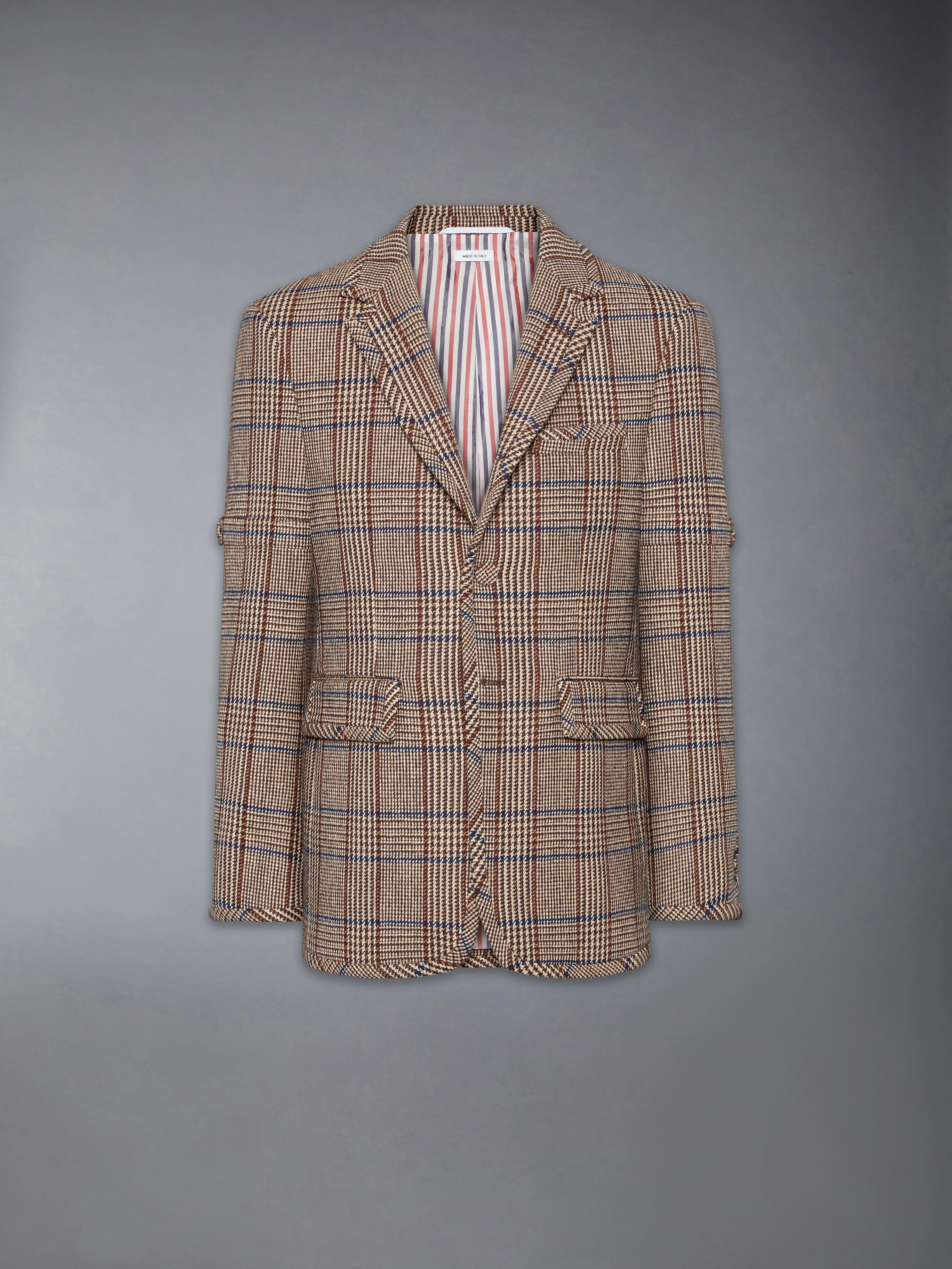 Thom’s iconic shrunken suit is reimagined for fall in luxurious Huntington tweed. Hallmarks of traditional men’s tailoring reach from the outside in—self-covered armbands and buttons—each a reflection of Thom’s unwavering devotion to craft. The silhouette stays true to its origins—precise, confident, unmistakably Thom Browne—while the rich texture of tweed adds warmth and depth. Complete the suit with our Huntington Tweed Trousers. Front button closure Single chest pocket 2 Front flap pockets Buttoned armbands Double-vented back Buttoned cuffs with signature striped grosgrain trim Signature striped grosgrain loop tab Fit 1 Model is 6'1" (185cm), wearing size 1 100% Wool Lining: 100% Cupro Made in Italy MJR126O-F1005-205