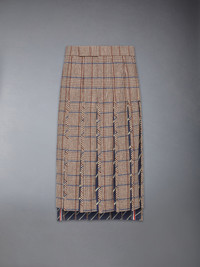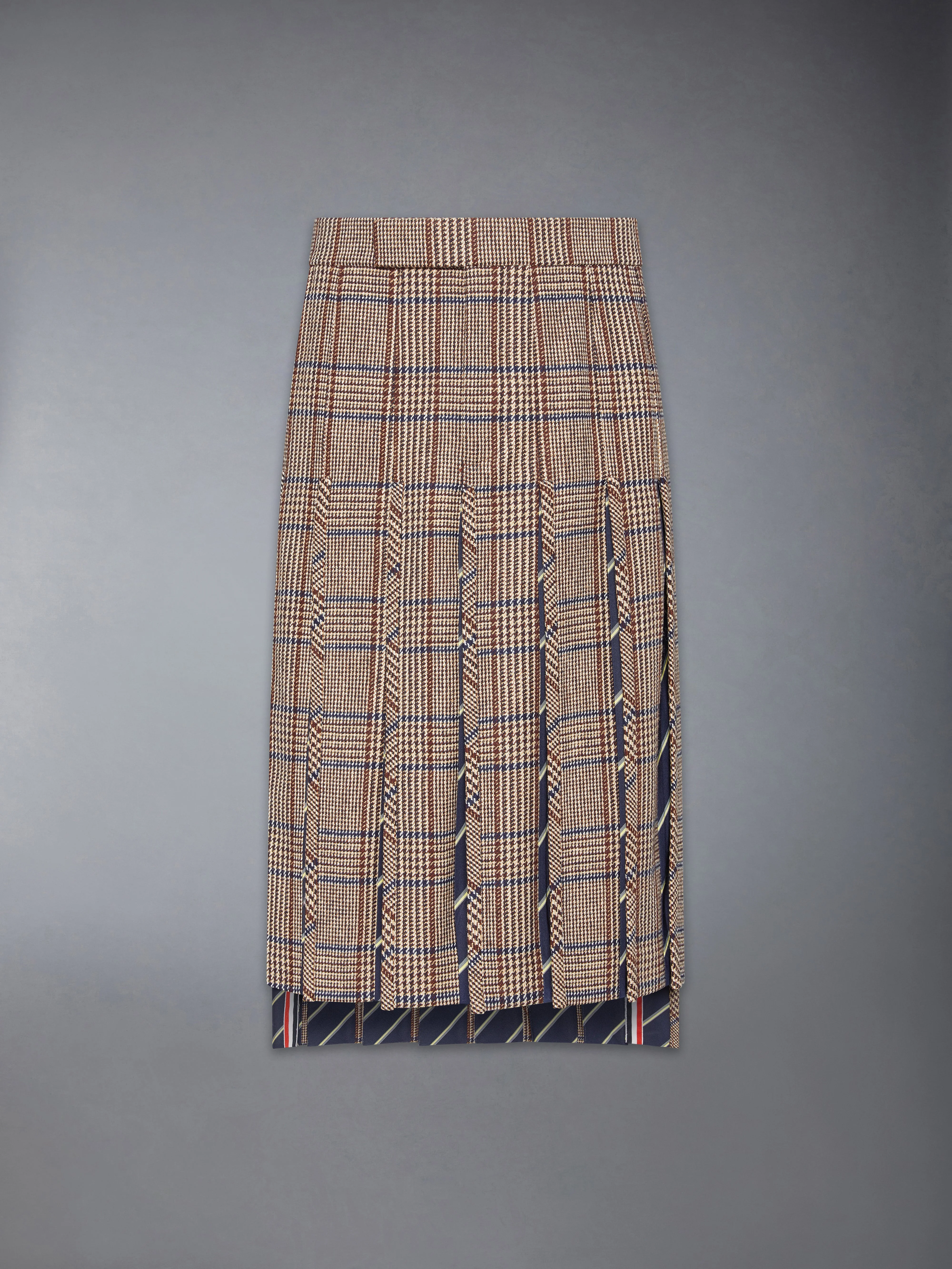 A skirt with more than meets the eye. Inverted pleats open to reveal unexpected pops of rep stripes—a hidden detail that demands a second glance. Functional pockets offer space to hold your phone and other essentials, seamlessly blending practicality with meticulous tailoring. Pairs beautifully with one of our Oxford button-downs. Tab front closure Side slip pockets Adjustable buttoned backstrap Model is 6'1" (185cm), wearing size 0 100% Wool Lining: 100% Cupro Made in Italy MGR039G-F1005-205