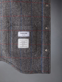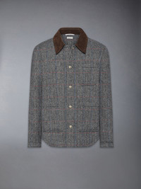 Bridging refined suiting and casual wear, this elevated utility jacket is the ideal layering piece for transitional dressing between seasons. Suede accents and polished silver buttons—each engraved with Thom Browne's insignia—reflect Thom's unwavering attention to detail. Three functional pockets offer space for essentials, seamlessly blending practicality with precise tailoring. Cut with a relaxed fit for comfort, it's a sharp wardrobe staple built to stand the test of time. Front snap button closure 3 Front patch pockets Snap button cuffs Signature striped grosgrain loop tab Model is 6'1" (185cm), wearing size 1 Combo 1: 100% Calf Leather Lining: 100% Cupro Made in Italy MJO251C-F1031-025