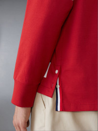 DETAILS & FIT A signature Thom Browne emblem defines this luxe long sleeve — our iconic 4-bar detailing. This casual shirt will serve as a staple in your seasonal wardrobe for years to come. Name tag applique 4-bar detailing Buttoned side vents with signature striped grosgrain trim Signature striped grosgrain loop tab Model is 6'1" (185cm), wearing size 1 100% Cotton Made in Japan MJS117A-06221-600 - CHEST: 116.0cm - LENGTH: 70.0cm - SLEEVE LENGTH: 63.0cm