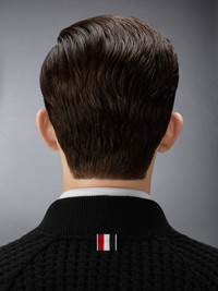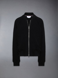 This bomber jacket is knit in chunky wool waffle for warmth and a tactile surface. Raglan sleeves and fully fashioned trims shape the silhouette with ease, while tonal 4-bar intarsia at the cuffs offers a subtle Thom Browne signature. Style with the Lightweight Shiny Ripstop 4-Bar Track Pants for a blend of structure and sport. Front two-way zip closure Ribbed bomber collar Hand pockets with ribbed trim Raglan sleeves Ribbed cuffs with 4-bar detailing Ribbed hem Name tag applique Signature striped grosgrain loop tab Model is 6'1" (185cm), wearing size 1 100% Wool Made in Japan MJT549A-05396-001