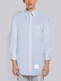DETAILS & FIT Oversized shirt in light blue satin weave Oxford with tonal 4-bar stripe detail at left sleeve. Front button closure, patch chest pocket, name tag applique above shirttail hem. Pleated back yoke with locker loop. Signature striped grosgrain loop tab at back of neck. Model is 6' 1" (185mm), wearing size 0. 100% Supima Cotton Made in Italy MWL329A06496480