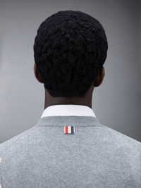 V-neck cardigan vest in light grey cashmere with 4-bar stripe detail at left shoulder in white. Front button closure and buttoned side vents with signature striped placket. 2 patch pockets. Ribbed hem. Signature striped grosgrain loop tab at back of neck. Model is 6' 1"; (185mm), wearing size 1. 100% Cashmere Made in the UK MKV001A-00011-055