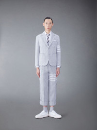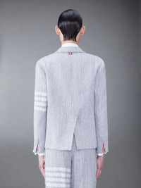 DETAILS & FIT Impeccable craftsmanship, fine fabric, and distinctive Thom Browne emblems make this jacket an essential garment for your seasonal wardrobe. Pair it with any of our tweed trousers. Our fine tweed fabric is sourced from a fabric mill founded in 1912 in Carlisle, England. 4-Bar detailing Front button closure 3 patch pockets Buttoned cuffs with signature striped grosgrain trim Single vented back Striped lining with interior pockets and name tag Signature striped grosgrain loop tab Fit 2 - Sack fit Model is 6' 1" (185cm), wearing size 0 61% Cotton, 21% Polyester, 7% Polyamide, 6% Acrylic, 3% Viscose, 1% Wool, 1% Acetate Lining: 100% Cupro MJU505T-F0512-035