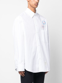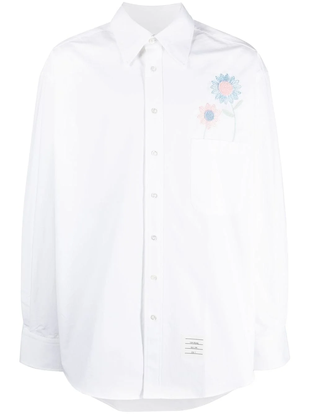 Madras Flower Patch-embroidered cotton shirt Thom Browne gives traditional shirting a playful twist for SS23. Retaining classic features such as a pointed collar, this iteration is adorned with a signature 'Madras Flower' patch cascading down the shoulder. Recognisable elements of the brand such as a grosgrain loop tab to the rear and a name tag patch to the side enforce a branded feel. Highlights - White - Cotton - Signature grosgrain loop tab - Floral embroidery - Classic collar - Front button fastening - Long sleeves - Buttoned cuffs - Signature name tag applique to the side - Chest patch pocket - Curved hem Made in Italy Composition Polyester 100%, Cotton 100% SIZE & FIT Model measurements Height 6 ft 2 in(1.87 m) Bust/Chest 38.18 in(97 cm) Hips 36.61 in(93 cm) Waist 29.13 in(74 cm) FittingInformation Designed for an oversized fit, offering additional room throughout Made from a midweight non-stretch fabric This piece fits true to size – take your usual size Washing instructions Machine Wash