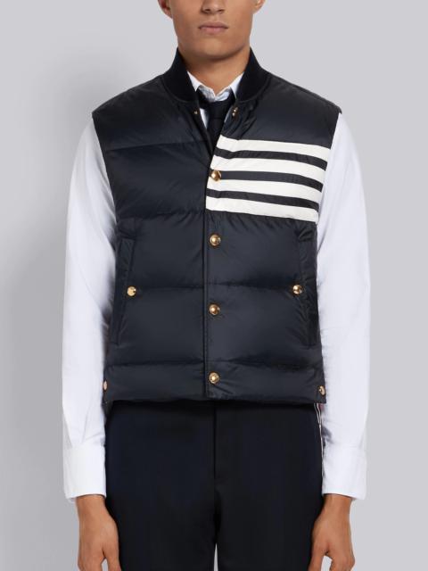 Navy Snap-Front Vest Contrast 4-Bar Stripe Dropped Back Down-Filled Rib Collar Welt Pockets Nylon Matte Finish Signature Grosgrain Trim Signature Grosgrain Loop Tab Model is 6'1"; (186 cm), wearing size 0. MVD017X-05411-415