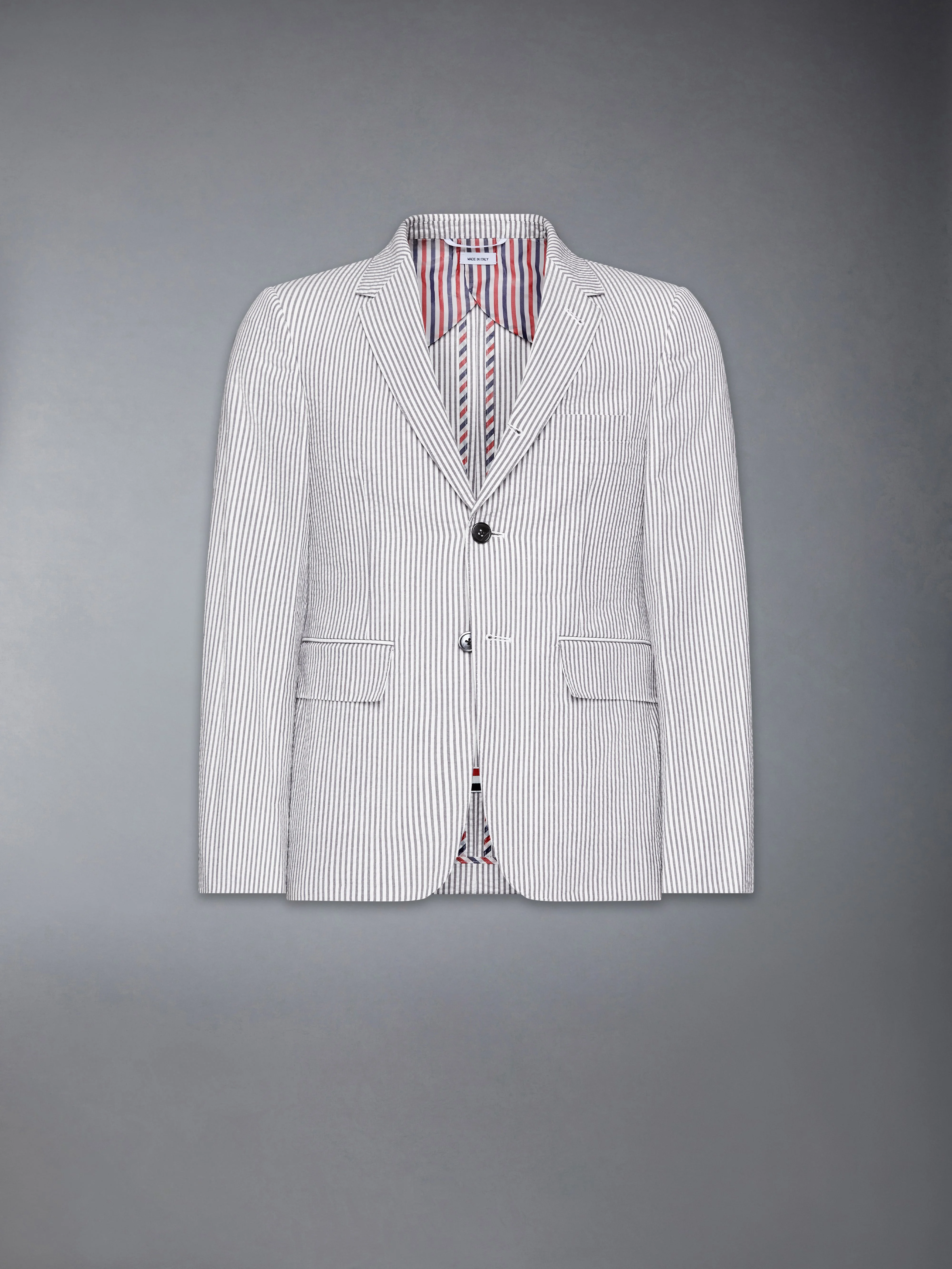 DETAILS & FIT Inspired by East Coast preppy icons but reimagined with inventive proportions and quality craftsmanship, our Classic Seersucker Sport Coat is an airy, playful twist on a Thom Browne classic. Front button closure Notched lapels 2 flap front pockets Single chest pocket Buttoned cuffs with signature striped grosgrain trim Double back vent Striped lining with interior pocket and name tag Signature striped grosgrain loop tab at back of neck ClassicFit 1 Model is 6' 1" (185cm), wearing size 0 100% Cotton Lining: 100% Cupro Made in Italy MJC001H-00572-035
