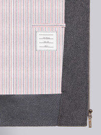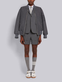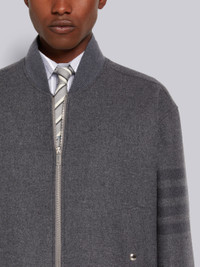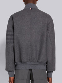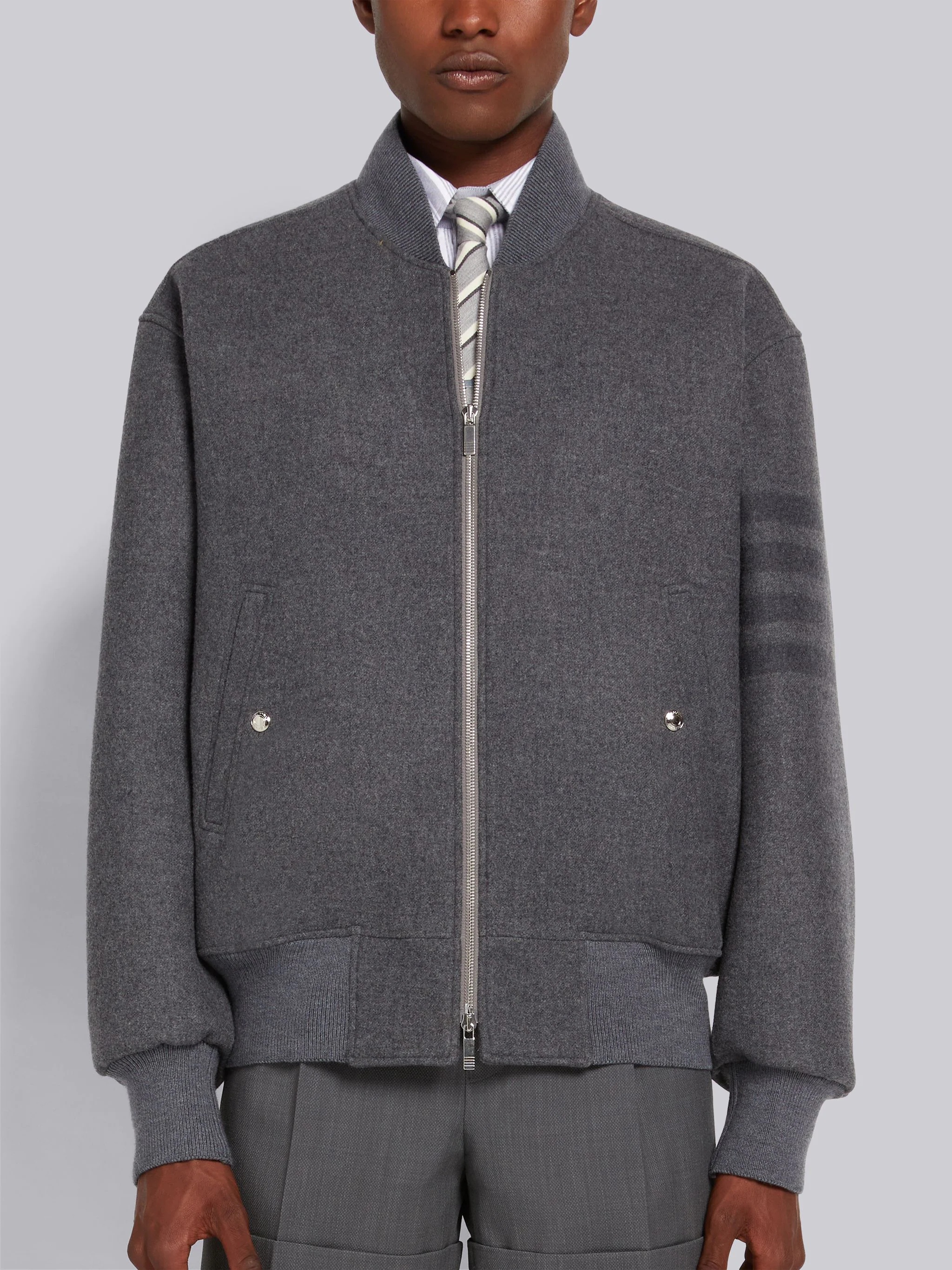 DETAILS & FIT Oversized blouson jacket in medium grey Melton wool with tonal 4-bar stripe detail at left sleeve. 2-way zip closure, snap-fastening slant pockets. Rib knit collar, cuffs, and hem. Striped lining with interior pocket and name tag. Signature striped grosgrain loop tab at back of neck. Model is 6' 1" (185mm), wearing size 0. 95% Wool, 5% Cashmere Made in Italy MJO167A07553035