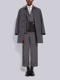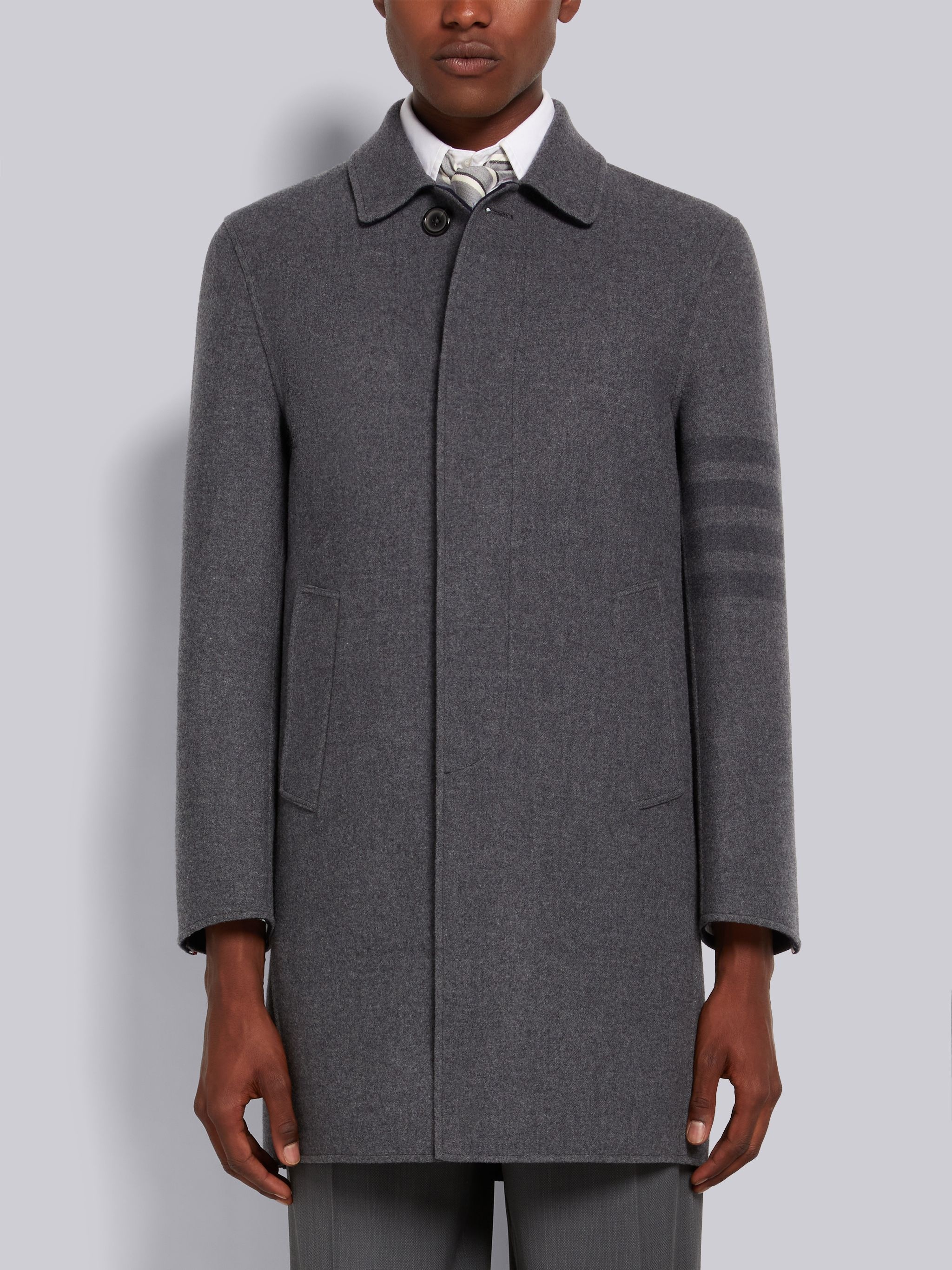 DETAILS & FIT Unconstructed relaxed bal collar overcoat in medium grey double face Melton wool with tonal 4-bar stripe at left sleeve. Concealed button closure, spread collar, slant welt pockets. Buttoned back vent. Buttoned cuffs with signature striped grosgrain trim. Signature striped grosgrain loop tab at back of neck. Model is 6' 1" (185mm), wearing size 0. 95% Wool, 5% Cashmere Made in Italy MOU588A07553035