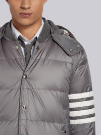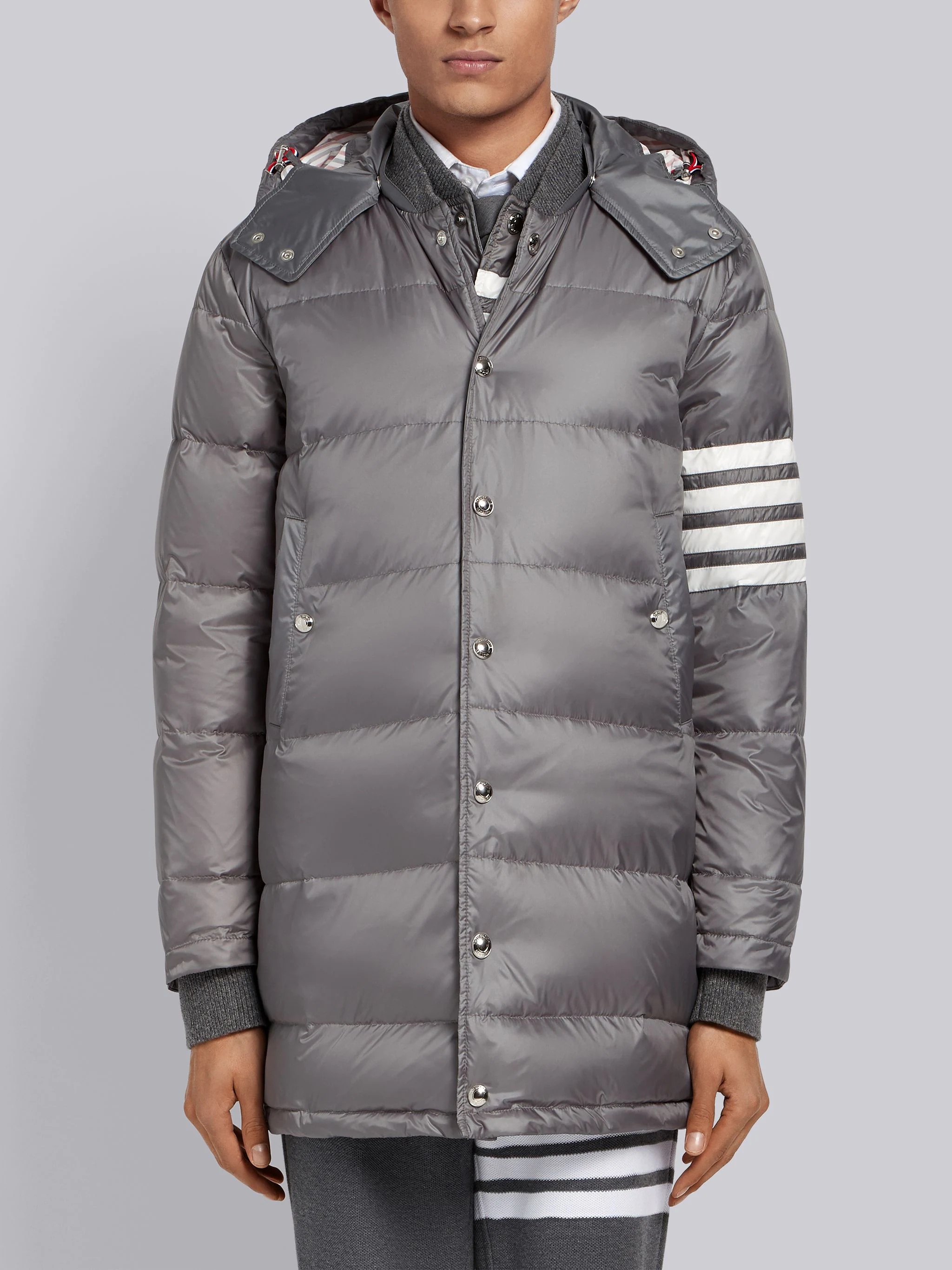 DETAILS & FIT Medium Grey Snap-Front Coat Contrast 4-Bar Stripe Nylon Matte Finish Welt Pockets Down-Filled Silver Hardware Detachable Hood Signature Grosgrain Loop Tab Model is 6'1" (186 cm), wearing size 0. NOTES 100% Polyamide Shell 80% Down 20% Feather Made in Italy MOD041X05411035