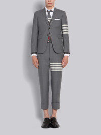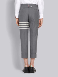 DETAILS & FIT Our Plain Weave 4-Bar Backstrap Trouser. The classic shortened hem pays homage to Thom Browne's distinguished tailoring. Tab front closure Adjustable buttoned backstrap 4-bar stripe detail Slip side pockets Button-fastening jetted hip pockets Signature striped grosgrain loop tab at back waist Model is 6' 1" (185cm), wearing size 0 100% Wool Lining: 100% Cupro Made in Italy MTC001A-06146-035