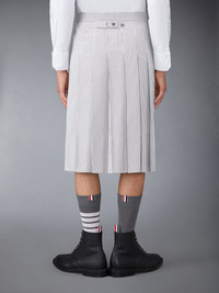 DETAILS & FIT Inspired by East Coast preppy icons but reimagined with inventive proportions and quality craftsmanship, our Classic Seersucker Pleated Skirt is a bold summer staple. Tab closure Dropped back hem with signature striped grosgrain trim Adjustable buttoned backstrap Signature striped grosgrain loop tab at back waist ClassicFit 1 Model is 6' 1" (185cm), wearing size 0 100% Cotton Made in Italy MGC019A-00572-035