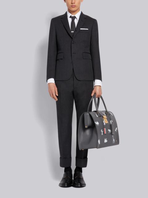 DETAILS & FIT Epitomized by Thom Browne himself, our classic Twill Suit and Tie was inspired by East Coast preppy icons but reimagined with inventive proportions and quality craftsmanship. Since its introduction, the suit has maintained its remarkable influence and integrity. Front button sport coat closure Notched lapels 2 flap front pockets, single chest pocket Classic slim tie Tab front trouser closure Creased pant legs Wide cuffs Slip side pockets, Button-fastening jetted hip pockets Striped side pockets with interior pocket and name tag Adjustable buttoned backstrap Signature striped grosgrain loop tabs at back of neck and waist ClassicFit 1 Model is 6' 1" (185cm), wearing size 0 100% Wool Lining: 100% Cupro Made in Italy MSC001A-00626-035
