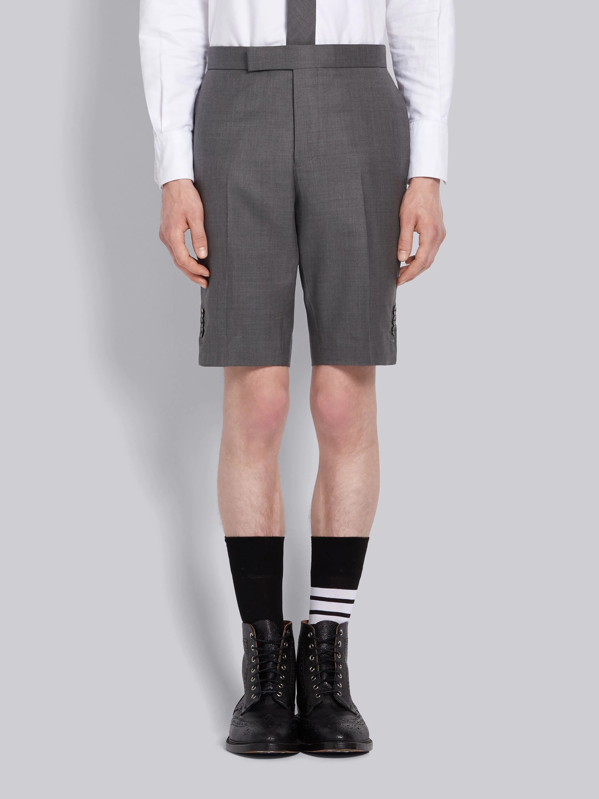 DETAILS & FIT Medium Grey Classic Suit Shorts Super 120s Wool Twill Button-Front French Fly Jetted Hip Pockets Adjustable Backstrap Signature Grosgrain Loop Tab Model is 6' 1" (185cm), wearing size 1. NOTES 100% Wool Made in Italy MTC002A00626035