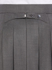 DETAILS & FIT Ankle length pleated skirt in medium grey super 120's wool twill with buttoned backstrap. Tab closure. Stepped hem with signature striped grosgrain trim. Model is 6' 1" (185mm), wearing size 0. 100% Wool Made in Italy MGC096A00626035