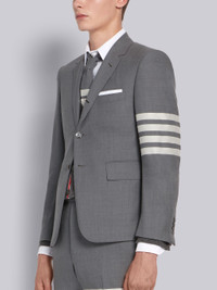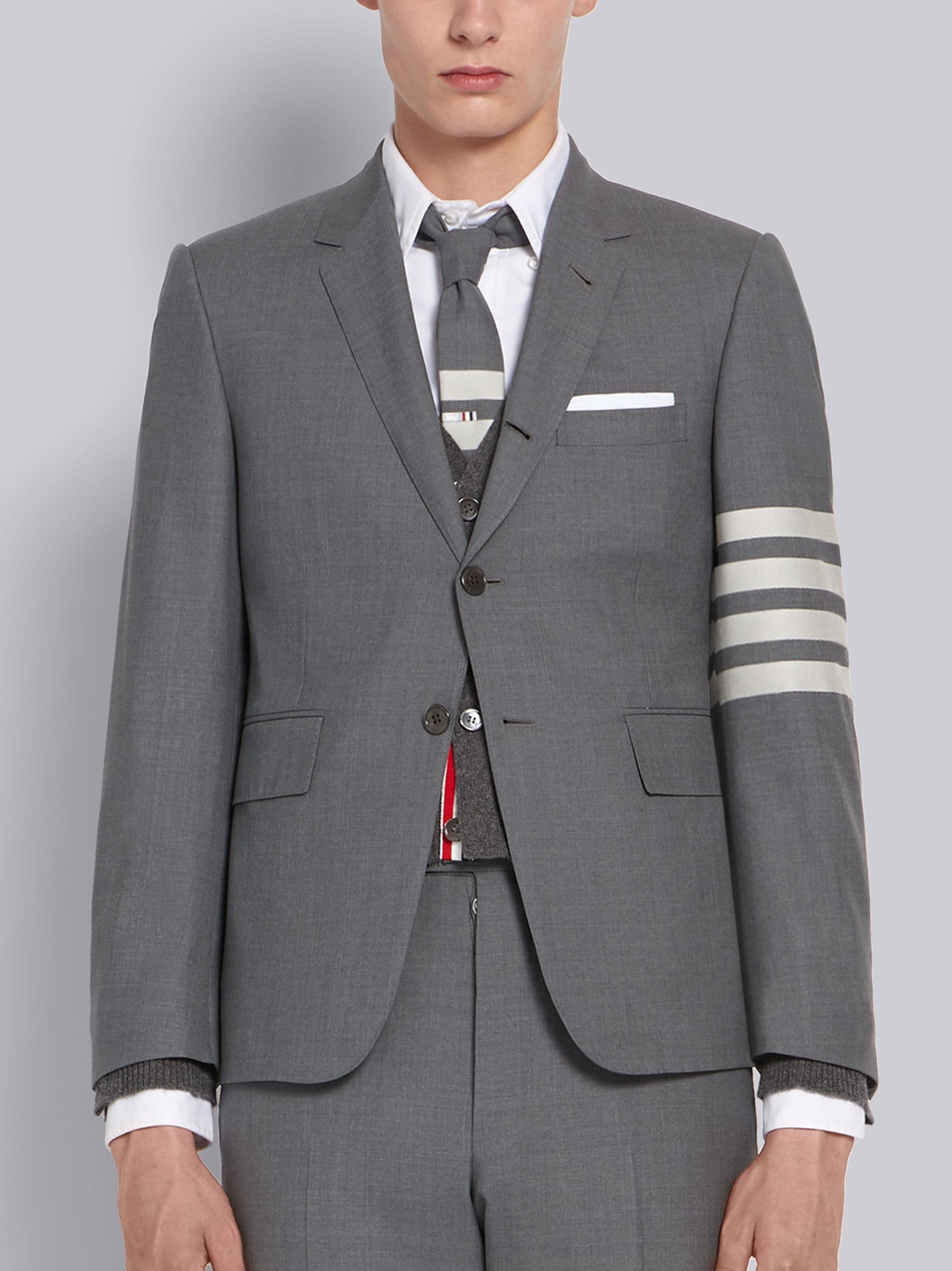 DETAILS & FIT Medium Grey Sport Coat Plain Weave Suiting Contrast 4-Bar Stripe Single-Breasted Double Vent Notched Lapel Two Flap Pockets Single Chest Pocket Signature Grosgrain Trim Signature Grosgrain Loop Tab Model is 6'1" (186 cm), wearing size 0. NOTES 100% Wool Made in Italy MJC001A06146035