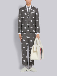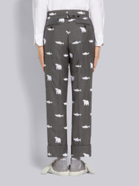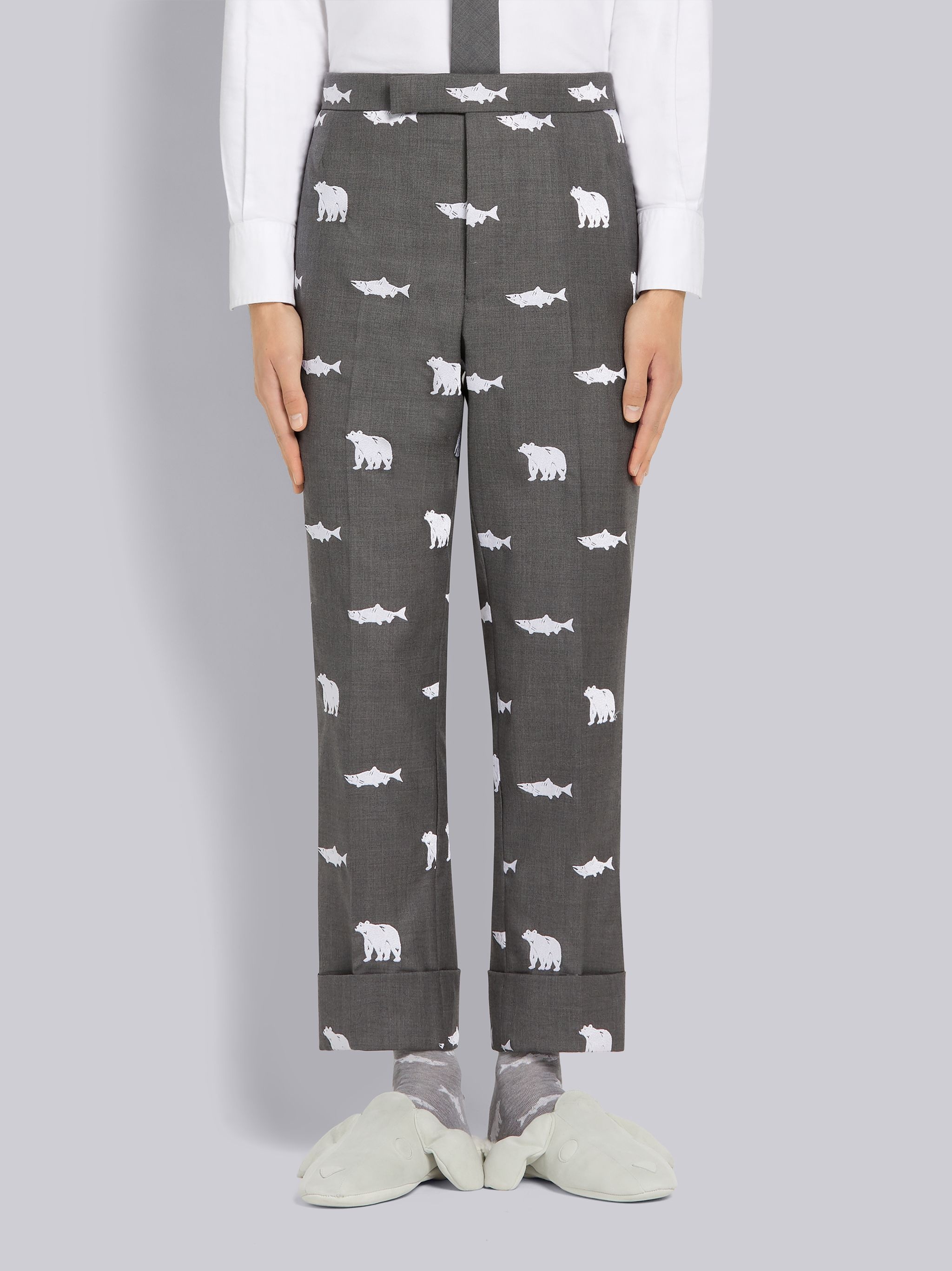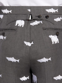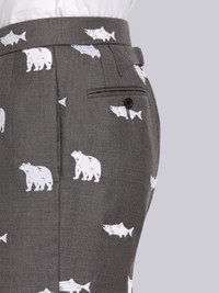 DETAILS & FIT Classic backstrap trouser in super 120's medium grey wool twill with allover half drop bear and salmon embroidery details in white. Tab closure with buttoned back strap. Cuffed hems. Classic - Fit 1. Model is 6' 1" (185mm), wearing size 0. 60% Wool, 40% Viscose Made in Japan MTC001e07601035