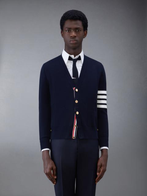 DETAILS & FIT Two Thom Browne emblems define our Cotton Crepe V-neck Cardigan—grosgrain trim and 4-Bar stripe detailing, both synonymous with the brand. V-neckline Front button closure with striped grosgrain placket 4-bar stripe detail at left sleeve Buttoned side vents and cuffs with signature striped grosgrain trim Signature striped grosgrain loop tab at back of neck Buttoned side vents and cuffs with signature striped grosgrain trim Center stripe through back and hood Model is 6' 1" (185cm), wearing size 1 100%Cotton Made in Italy MKC171A-00219-035