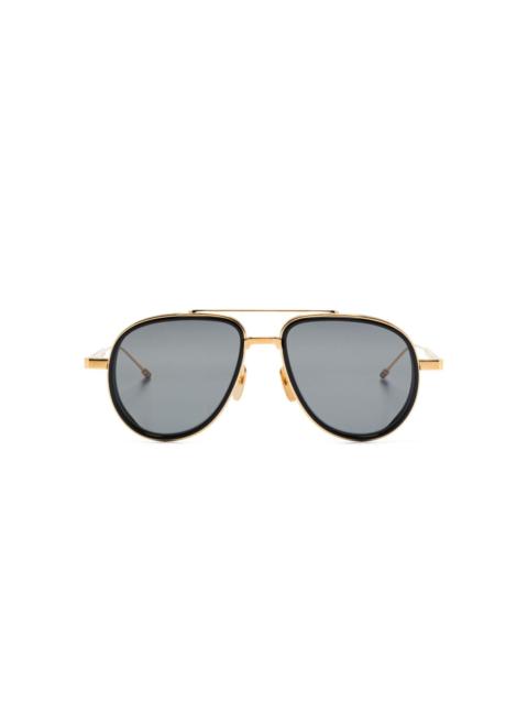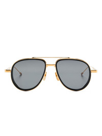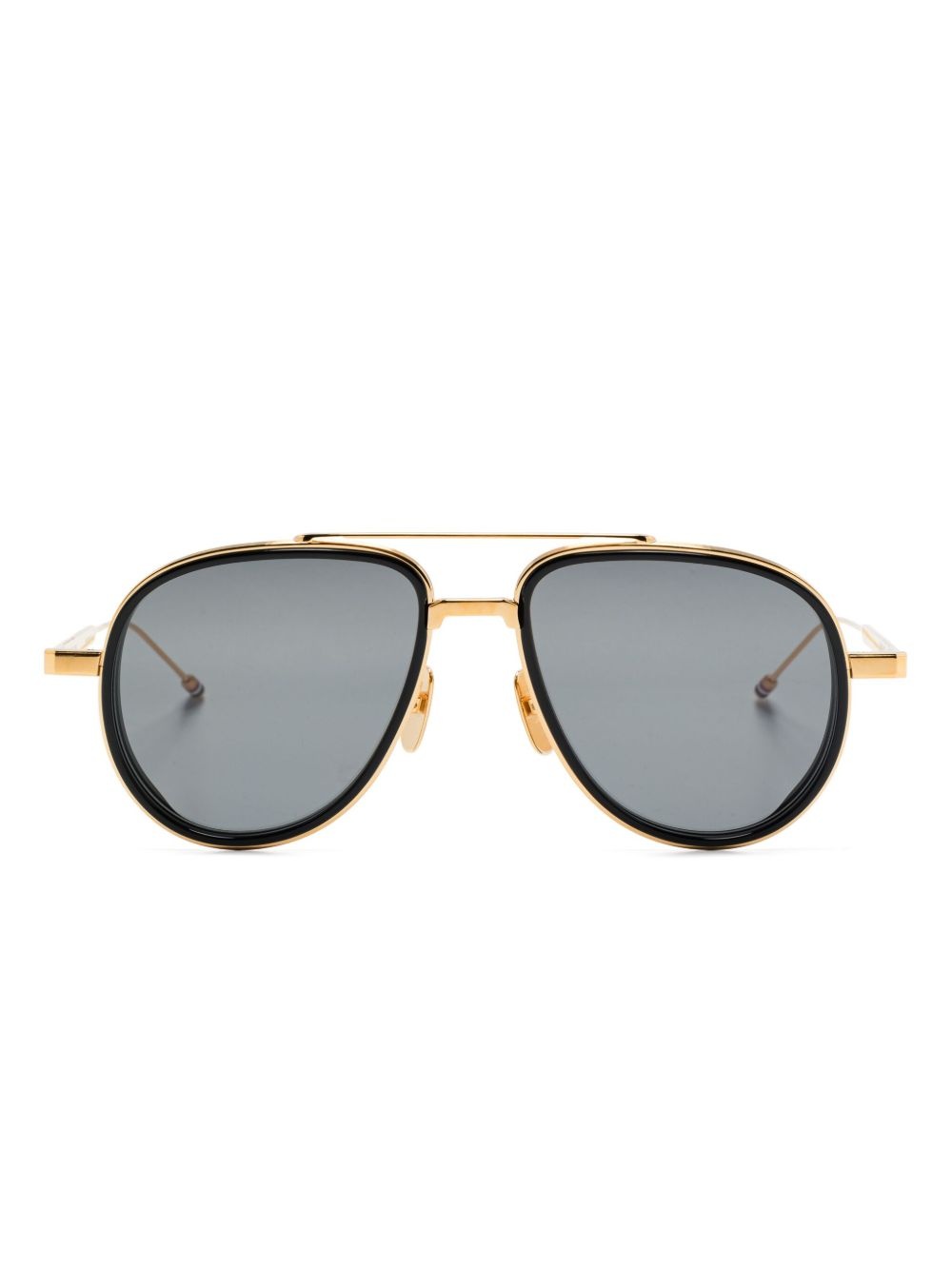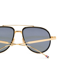 pilot-frame sunglasses Highlights - Gold-tone - Uv-protective lenses - Nose pads - Curved tips - These glasses come with a protective case. Imported Composition Titanium 100%, Acetate 100% SIZE & FIT Measurement Arm Length 5.51 in(14 cm) Bridge Width 0.86 in(2.2 cm) Lens Diameter 2.2 in(5.6 cm) Total Width 6.06 in(15.4 cm)