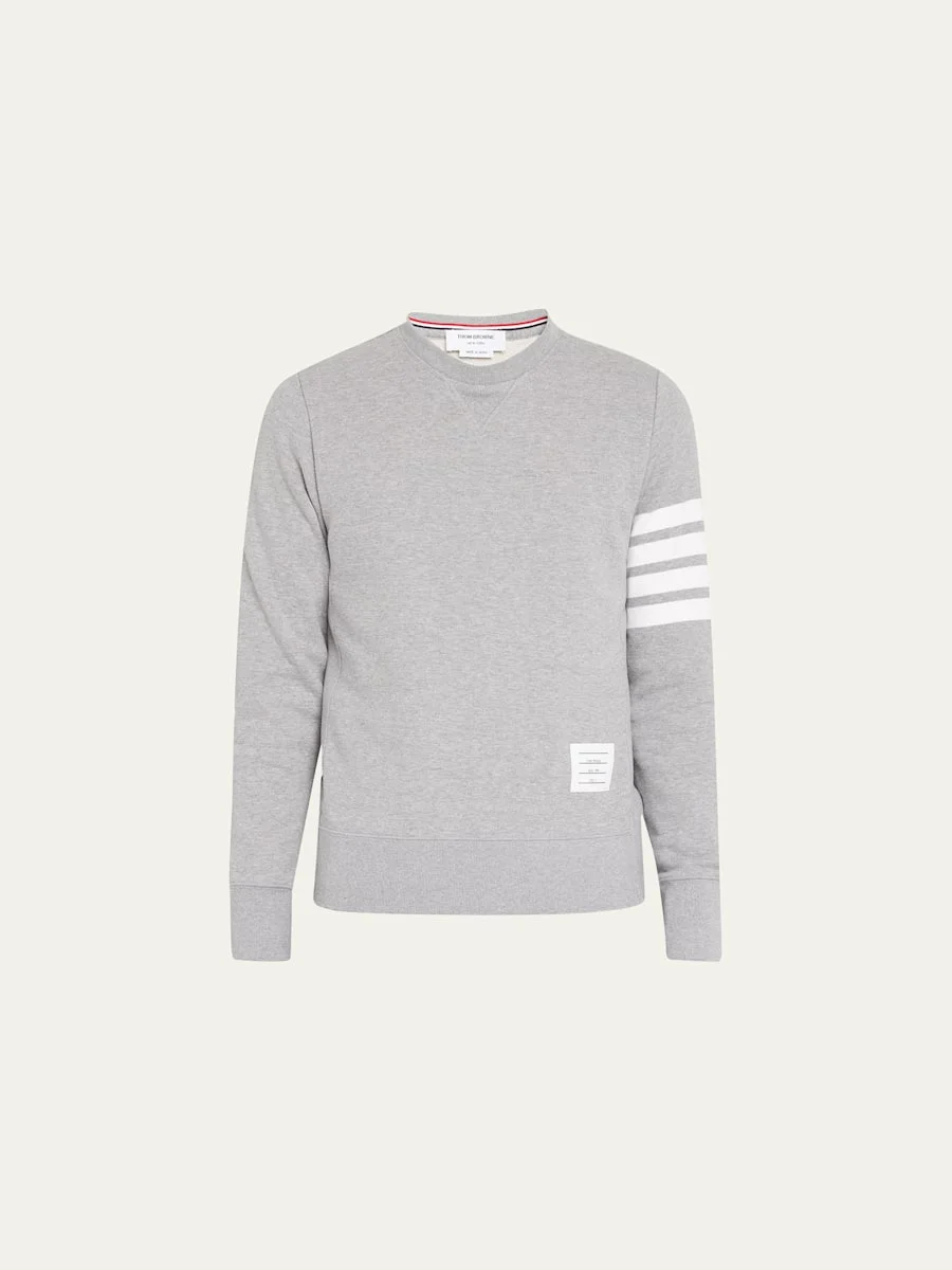 Thom Browne classic sweatshirt. Crew neckline. Long sleeves with signature stripe on left arm. Logo patch at bottom left. Ribbed cuffs and hem. Pullover style. Cotton. Imported.