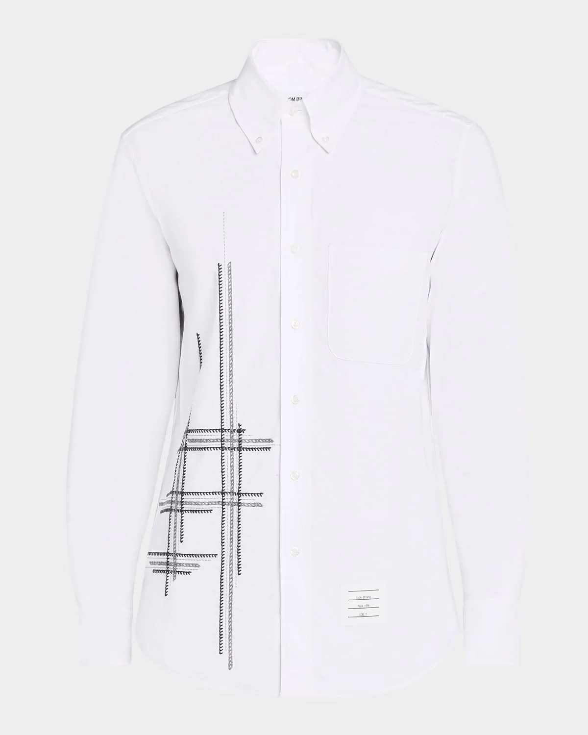This Thom Browne sport shirt is enriched with an expertly embroidered plaid motif Buttondown collar Button placket Long sleeves Round barrel cuffs Rounded hem Name tag applique on the hem Back neck signature striped grosgrain loop tab Straight fit Cotton/wool Dry clean Made in Italy
