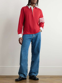 Thom Browne’s polo shirt has a relaxed cut inspired by sporty rugby styles. Detailed with a signature '4-Bar' stripe on the sleeve, it's been made in Japan from soft cotton-jersey and buttons along the sides and cuffs for a custom fit. Size & Fit - Size 0 = XS, 1 = S, 2 = M, 3 = L, 4 = XL, 5 = XXL and 6 = XXXL - Fits true to size. Take your normal size - Designed for a relaxed fit - Mid-weight, slightly stretchy fabric - Model is shown wearing a 2 - Model measures: chest 38"/ 96cm, height 6'0"/ 183cm Details & Care - Red and white cotton-jersey - 100% cotton - Machine wash