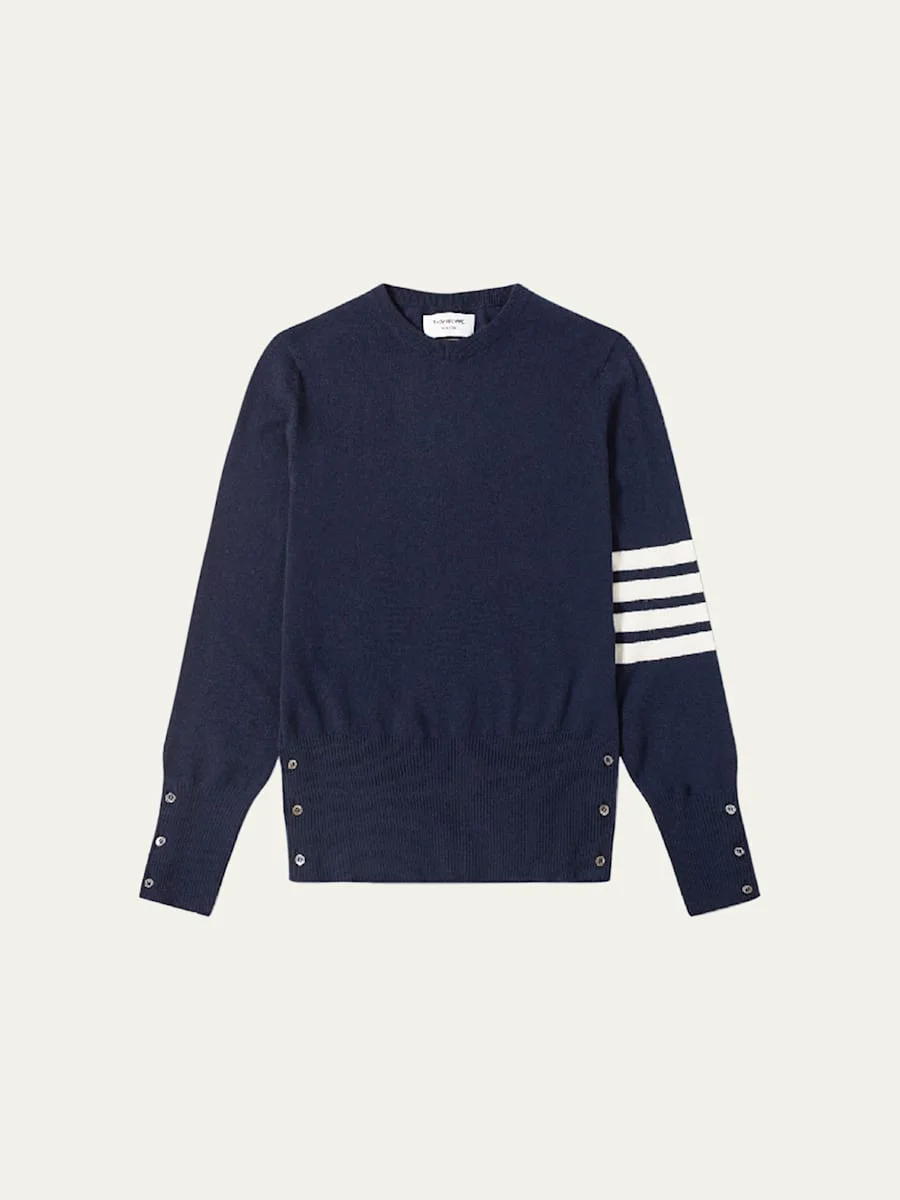 Thom Browne knit sweater with striped left sleeve. Crew neckline. Raglan sleeves. Banded hem. Pullover style. Cashmere. Made in Scotland. Model is 6'1"/185cm. Online Inquiries: BGS21_N4GPQ| Store Inquiries: #1819389