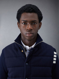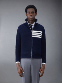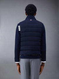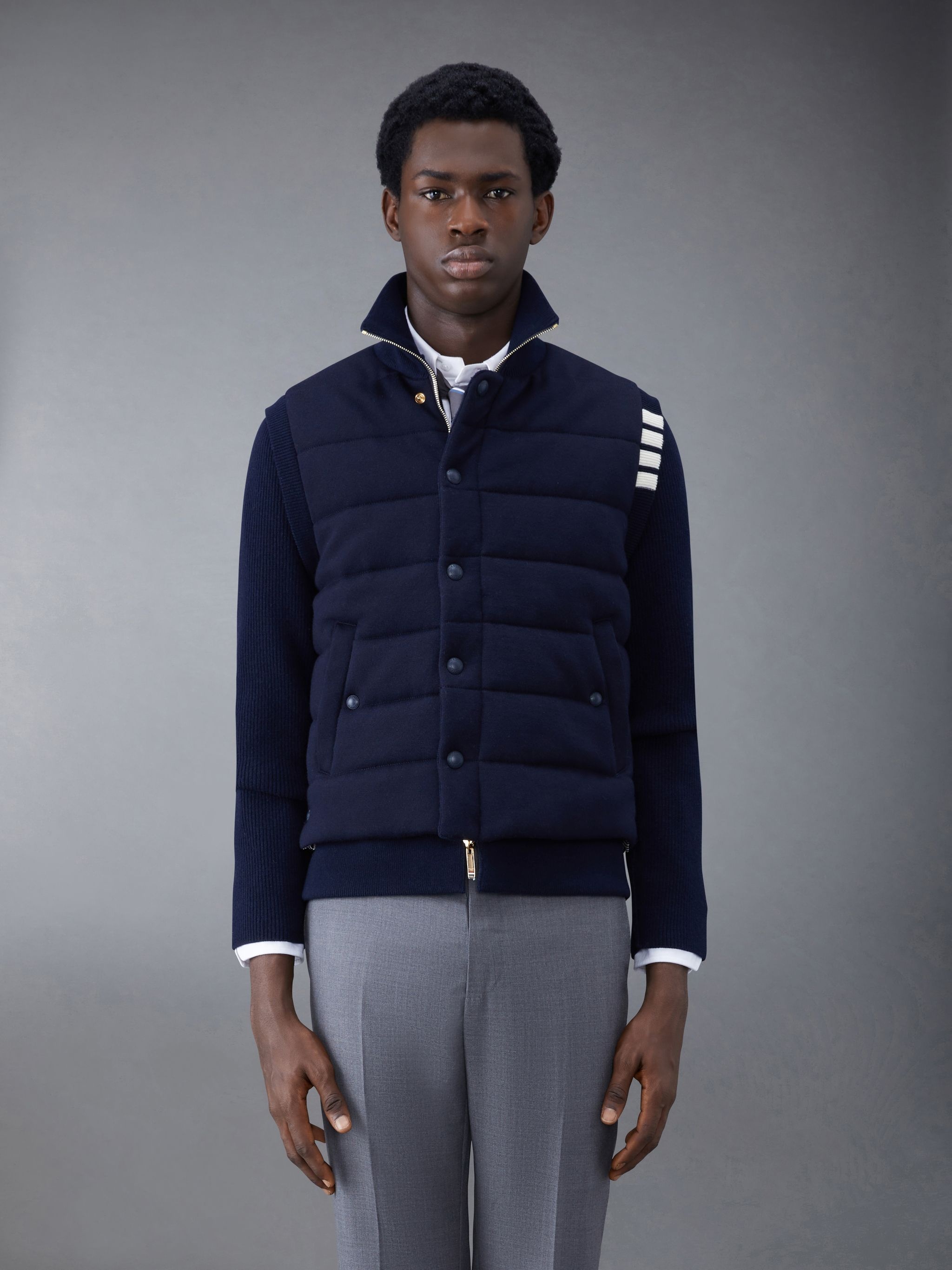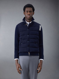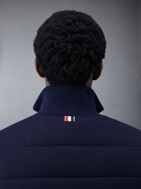 DETAILS & FIT Reversible padded funnel neck jacket in navy jersey and Merino wool. Snap button closure, snap-fastening slant welt pockets at both sides, 4-bar stripe detail at left shoulder in white. Signature striped grosgrain loop tab at back of neck on both sides. Model is 6' 1" (185cm), wearing size 0. 100% Virgin Wool Combo 1:100% Virgin Wool Lining1: 100% Cupro Padding: 100% Polyester Made in Italy MKJ109AY1029415