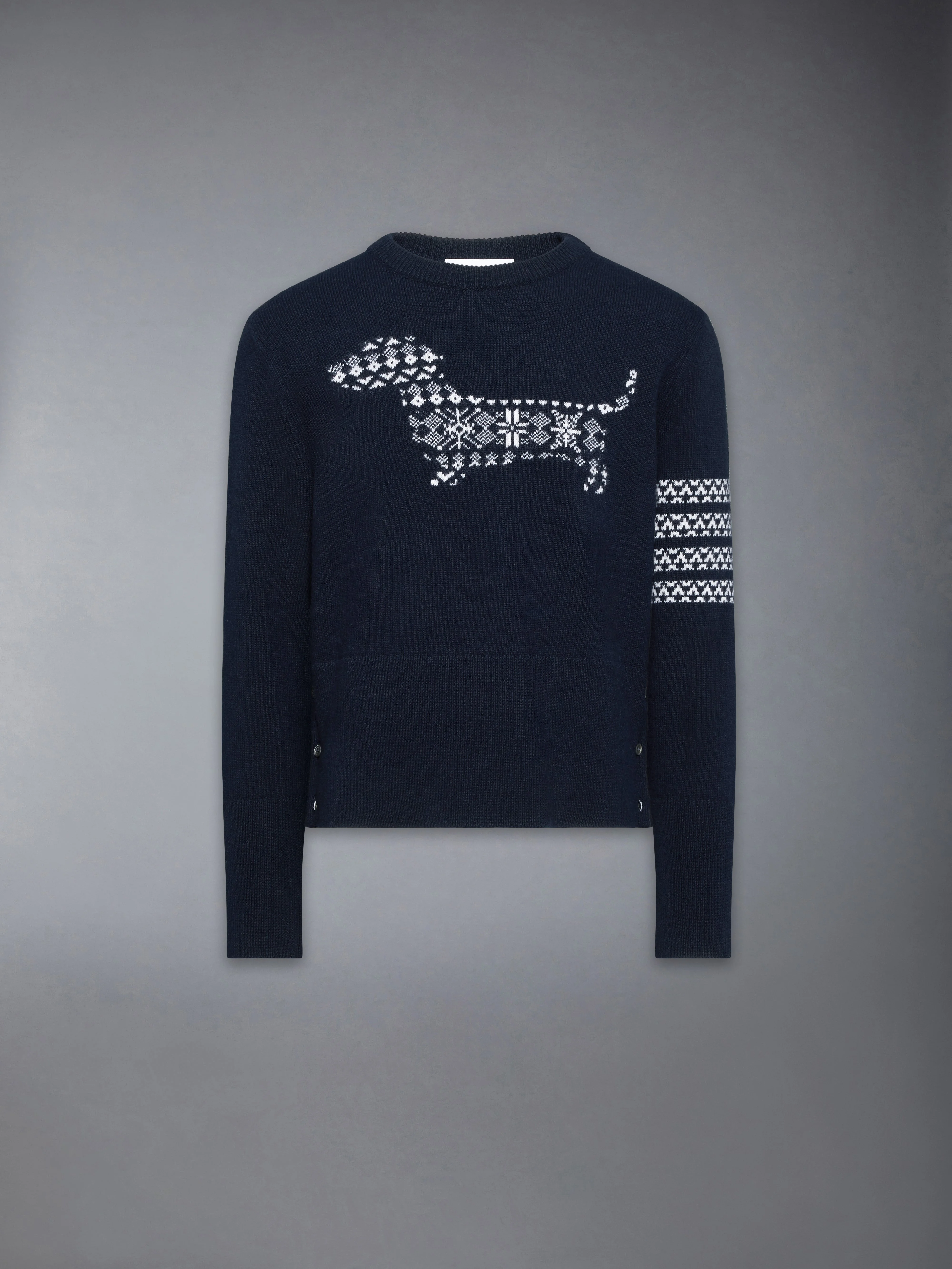 This crewneck pullover features a seasonal Hector intarsia, framed by Fair Isle–inspired 4-bar detailing at the sleeve. Knit in fine merino wool, it’s a winter layer that blends precision pattern work with the playfulness of a signature character—equal parts holiday spirit and knitwear discipline. Ribbed crew neckline Ribbed buttoned cuffs with internal RWB grosgrain trim Side vents with RWB grosgrain trim Ribbed hem Fair Isle–inspired 4-bar and Hector intarsia Signature striped grosgrain loop tab Model is 6'1" (185cm), wearing size 1 100% Virgin Wool Made in Italy MKA573A-Y1029-415