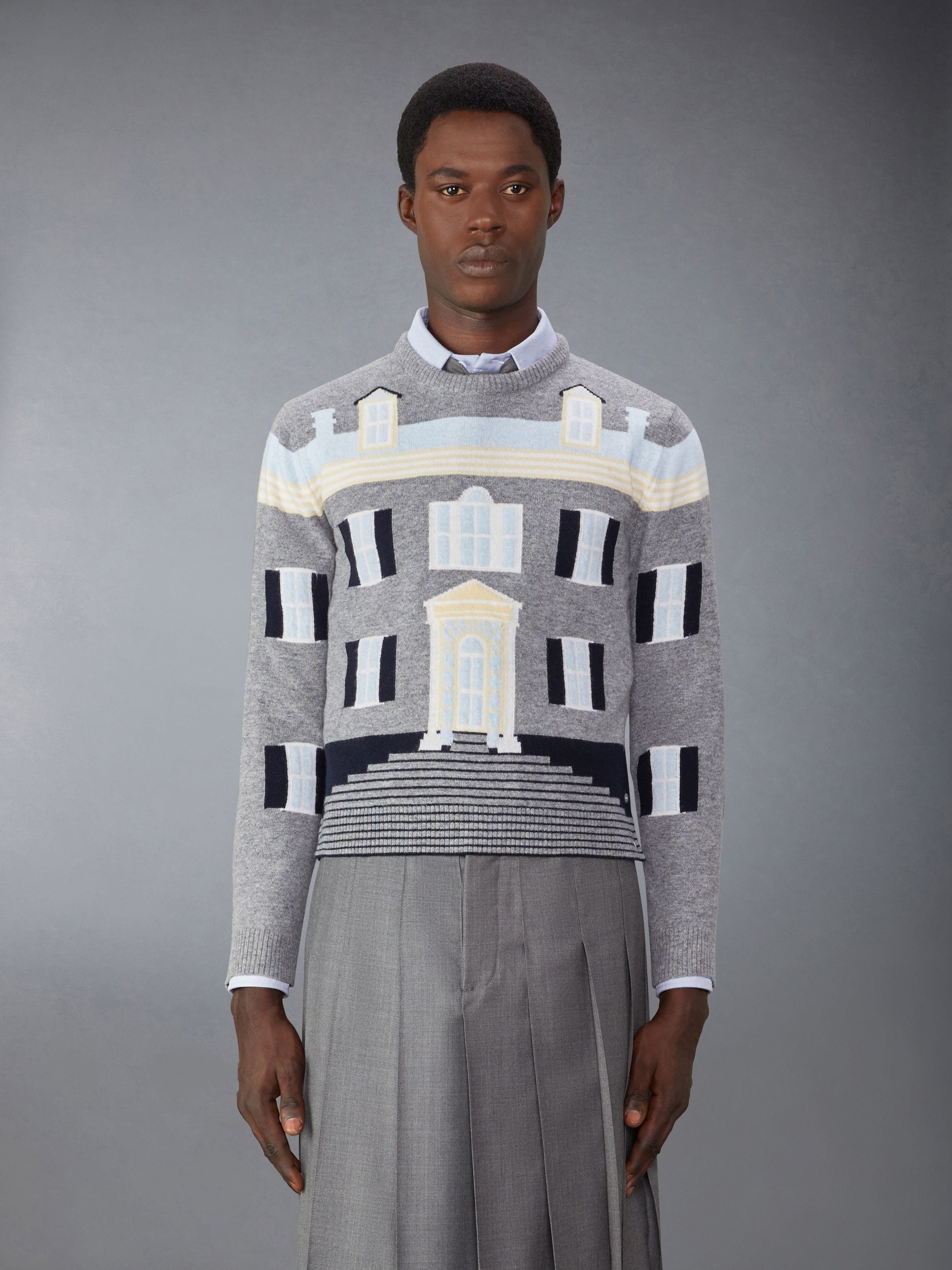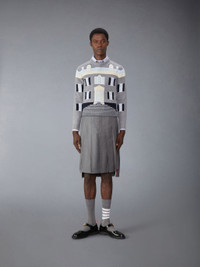 DETAILS & FIT Inspired by the historic 18th-century estate Thom calls home, this limited-edition pullover is a true work of art. Crew neckline Pullover Button side vents with signature striped grosgrain trim Button cuffs with signature striped grosgrain trim Signature striped grosgrain loop tab Model is 6' 1" (185cm), wearing size 1 100% Virgin Wool Made in Italy MKA520A-Y1029-055