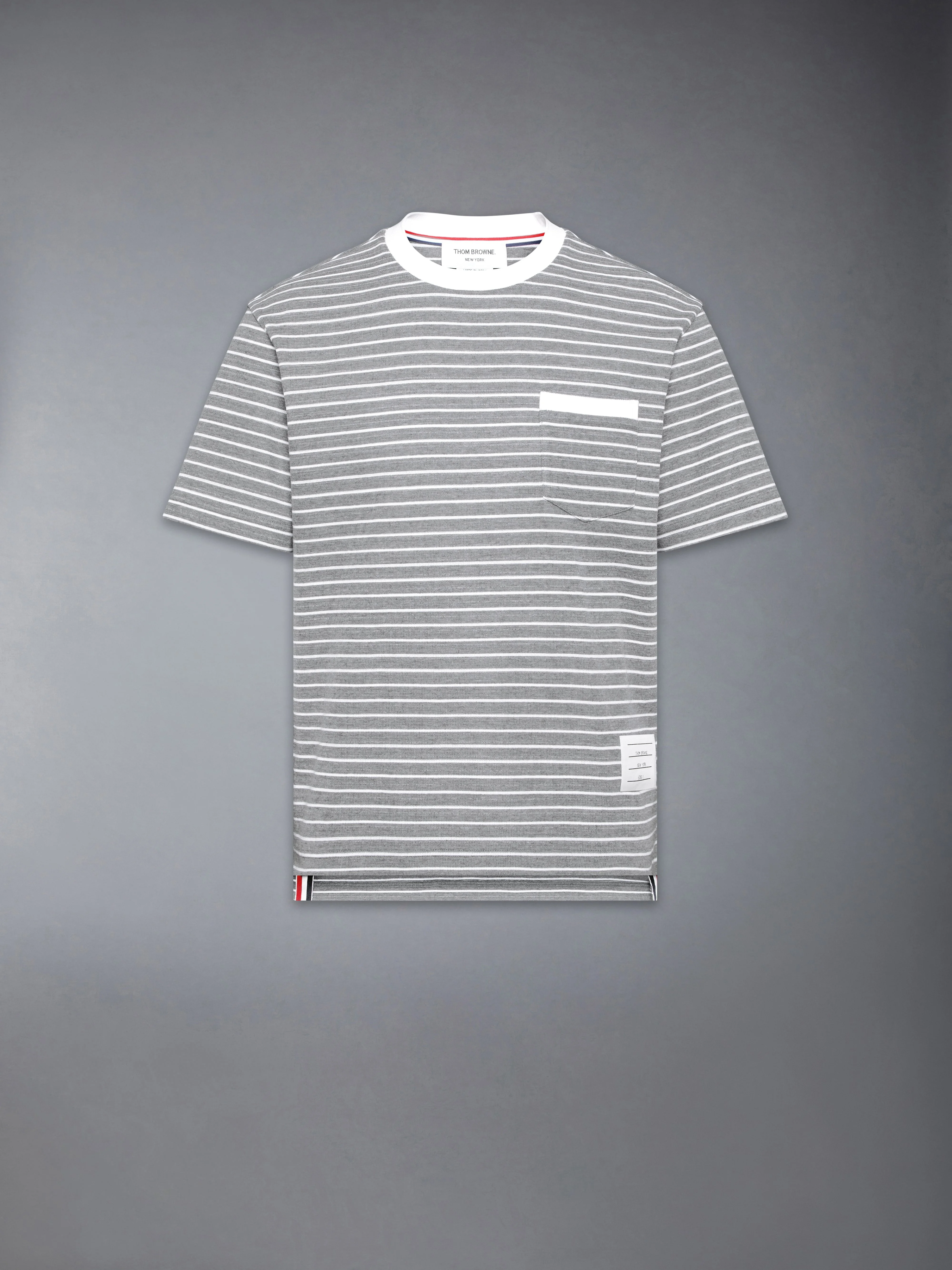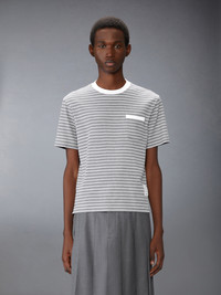 The epitome of quiet luxury, this classic tee in sky blue features subtle Thom Browne emblems at the hem and side vents. Elevate simple slacks or dress shorts with this casual, everyday staple. Chest patch pocket Name tag applique Buttoned side vents with signature striped grosgrain trim Dropped back hem Signature striped grosgrain loop tab Model is 6'1" (185cm), wearing size 1 100% Cotton Made in Italy MJS291A-J0218-039