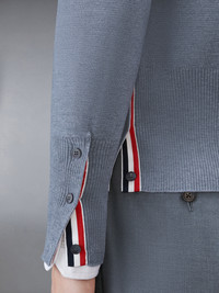 DETAILS & FIT Two Thom Browne emblems define our Wool 4-Bar V-neck Cardigan —grosgrain trim and 4-Bar stripe detailing, both synonymous with the brand. Presented in fine merino fabric, this cardigan exudes sophistication. V-neckline Front button closure with striped grosgrain placket 4-bar stripe detail at left sleeve Buttoned side vents and cuffs with signature striped grosgrain trim Signature striped grosgrain loop tab at back of neck Model is 6' 1" (185 cm), wearing size 0 100% Virgin Wool Made in Italy MKC160A-00014-035