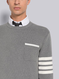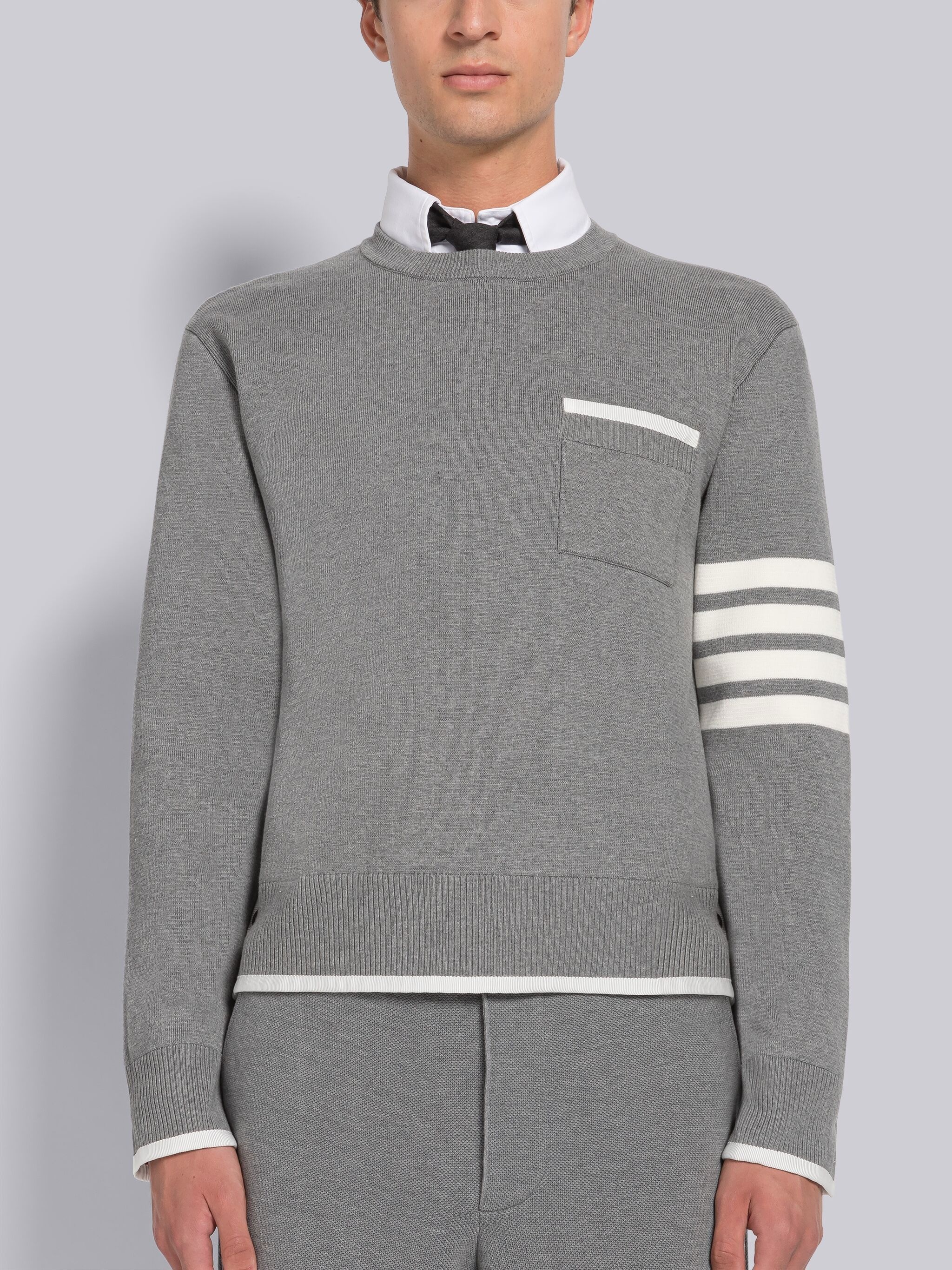 DETAILS & FIT Boxy crew neck pullover in grey Milano stitch cotton with 4-bar stripe detail at left sleeve and grosgrain tipping details in white. Ribbed cuffs and hem, patch chest pocket. Buttoned side vents and cuffs with signature striped grosgrain trim. Signature striped grosgrain loop tab at back of neck. Model is 6' 1" (185cm), wearing size 1. 100% Cotton Made in Italy MKA452AY3006055