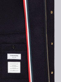 DETAILS & FIT Simplified snap front rain parka in navy military weight cashmere. Large brass snap-fastening flap front pockets, integrated hood, belted cuffs. Self-lined with button-fastening interior pocket. Signature striped grosgrain loop tab at back of neck. Model is 6' 1" (185cm), wearing size .0 100% Cashmere Lining: 100% Cupro Made in Italy MOT078A00898415