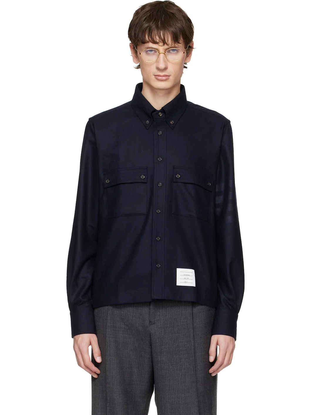 Wool-blend flannel shirt. · Spread collar · Button closure · Flap pockets at chest · Logo patch at front hem · Button vent at side seams · Buttoned barrel cuffs · Tricolor grosgrain flag at back collar · Locker loop at back yoke Supplier color: Navy 95% wool, 5% cashmere. Made in Italy 252381M192020