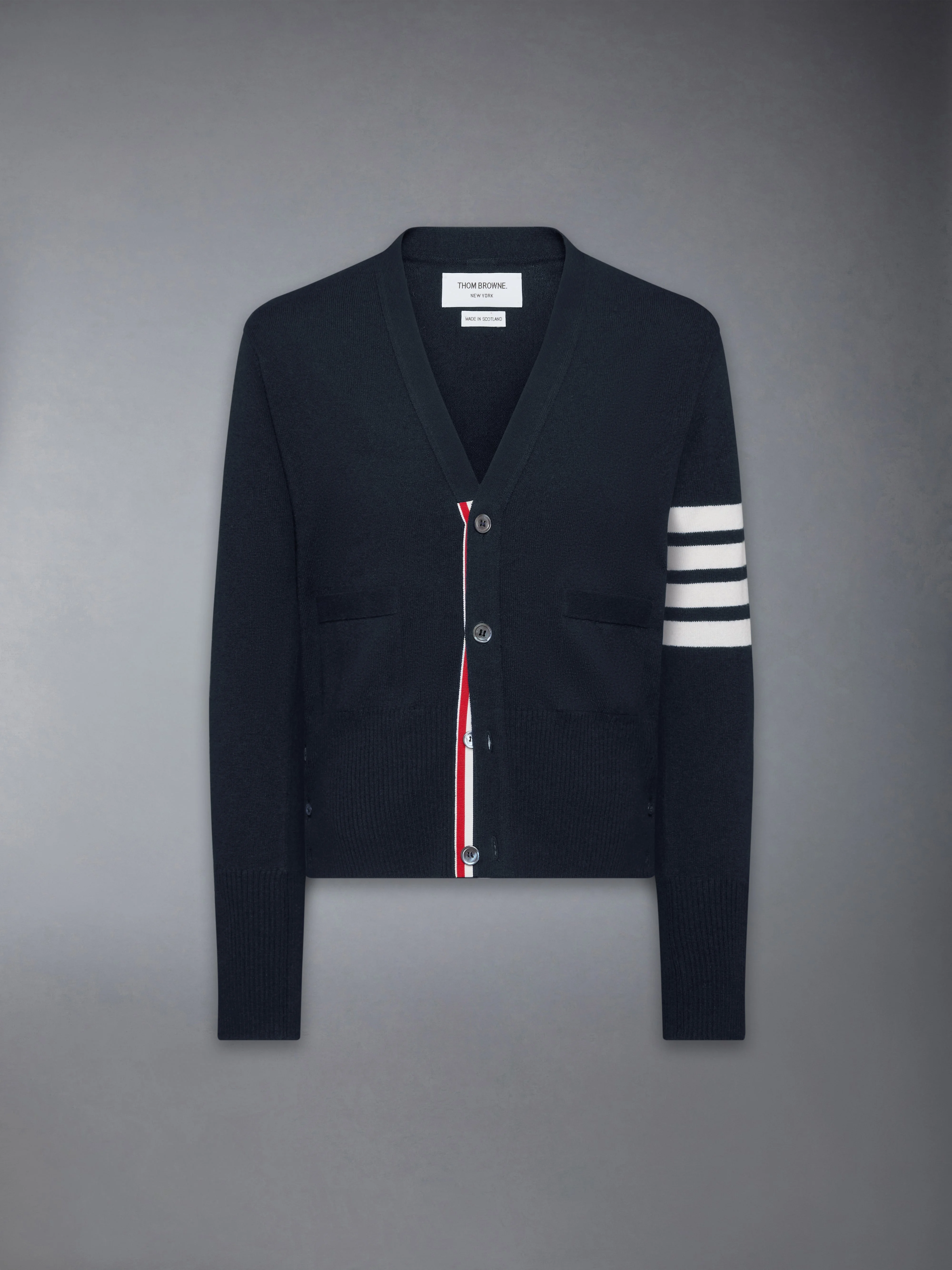 DETAILS & FIT A signature Thom Browne emblem defines our Classic Cashmere 4-Bar V-neck Cardigan. Presented in 100% rich cashmere, this cardigan is a longstanding staple. V-neck Front button closure with striped grosgrain placket 4-bar stripe detail at left sleeve Buttoned side vents and cuffs with signature striped grosgrain trim Signature striped grosgrain loop tab at back of neck Model is 6' 1" (185cm), wearing size 1 100% Cashmere Made in the UK MKC001A-00011-415 - CHEST: 106.0cm - Shoulder Width: 41.0cm