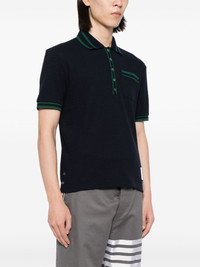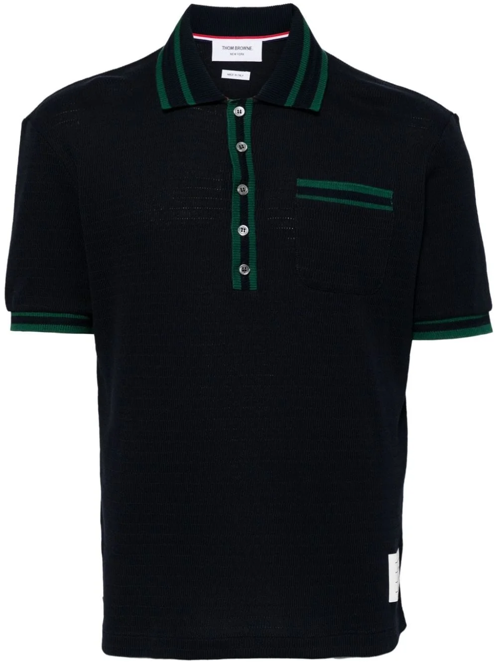 pointelle-knit cotton polo shirt Highlights - Navy blue/dark green - Cotton - Pointelle knit - Contrasting trim - Stripe trim - Polo collar - Front button placket - Short sleeves - Straight hem Made in Italy Composition Cotton 100% SIZE & FIT Model measurements Height 6 ft 2 in(1.87 m) Bust/Chest 33.07 in(84 cm) Hips 35.43 in(90 cm) Waist 26.77 in(68 cm) FittingInformation Designed for a regular fit, this polo shirt offers a comfortable loose fit throughout the body Made with a midweight knit, this piece offers some stretch This piece fits true to size – take your usual size Measurement LENGTH 25.59 in(65 cm) SLEEVE LENGTH 17.32 in(44 cm) Shoulder Width 16.92 in(43 cm)