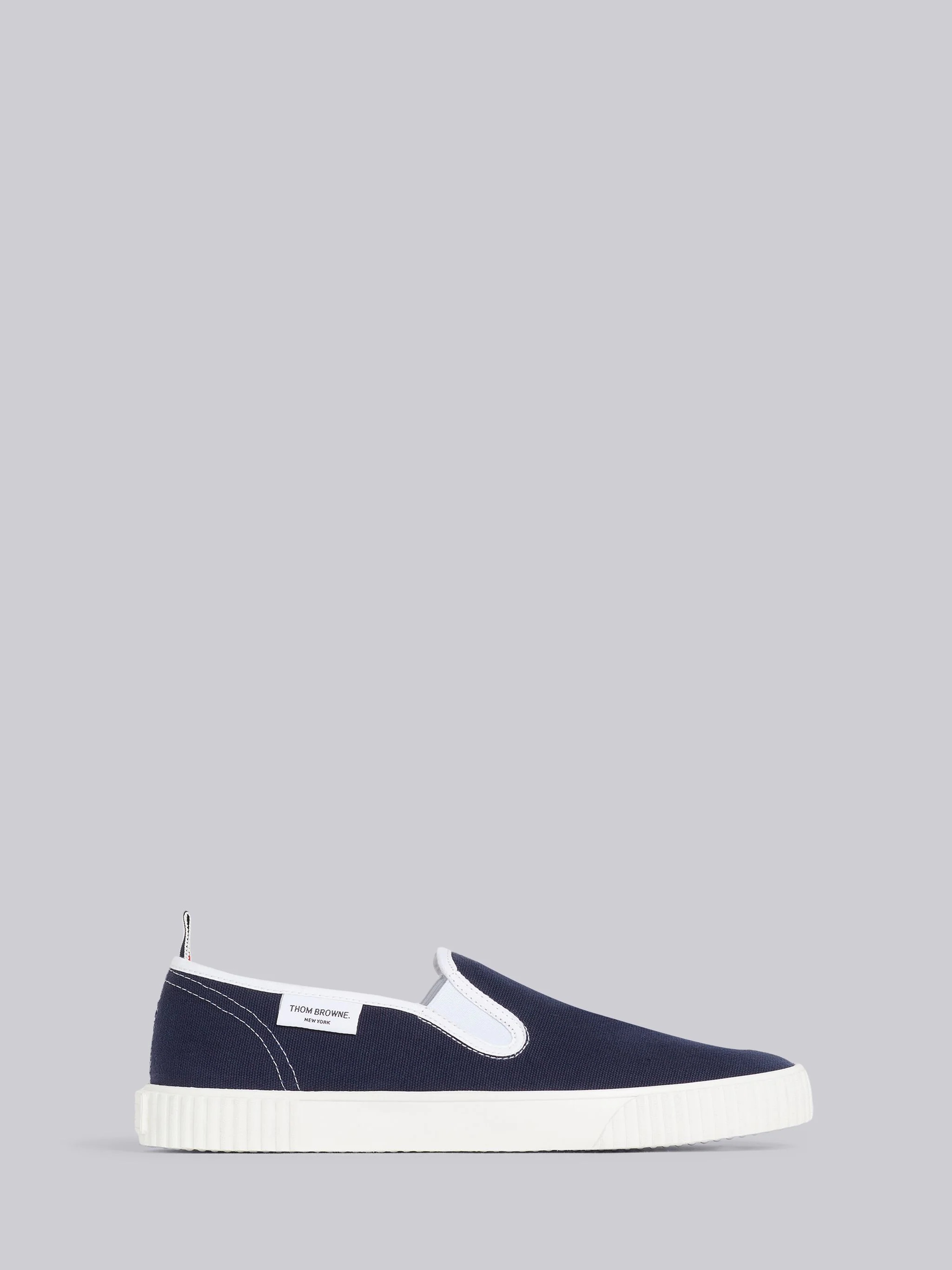 DETAILS & FIT Slip-on training shoe in navy cotton canvas with white rubber contrast sole. White elasticated gore and logo tag. Signature striped grosgrain loop tab at ankle. 80% Cotton, 20% Rubber Made in Spain MFL064A01588415