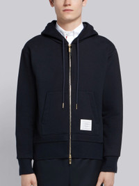 DETAILS & FIT Leisurewear made artful. Our Classic Loopback Full Zip Hoodie is adorned with a name tag applique and our iconic grosgrain stripe. 2-way silver tone front zip closure Drawstring hood with silver tone aglets Kangaroo pocket with name tag applique Model is 6' 1" (185cm), wearing size 0 100% Cotton Made in Italy MJT153A-03377-415