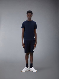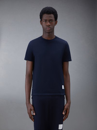 DETAILS & FIT A silhouette that has stood the test of time, our Classic Pique Stripe Tee is adorned with signature Thom Browne emblems and tailored to perfection. Crew neckline Name tag applique above hem Center back stripe detail Buttoned side vents with signature striped grosgrain trim Signature striped grosgrain loop tab at back of neck Model is 6' 1" (185cm), wearing size 0 100% Cotton Made in Italy MJS056A-00050-415