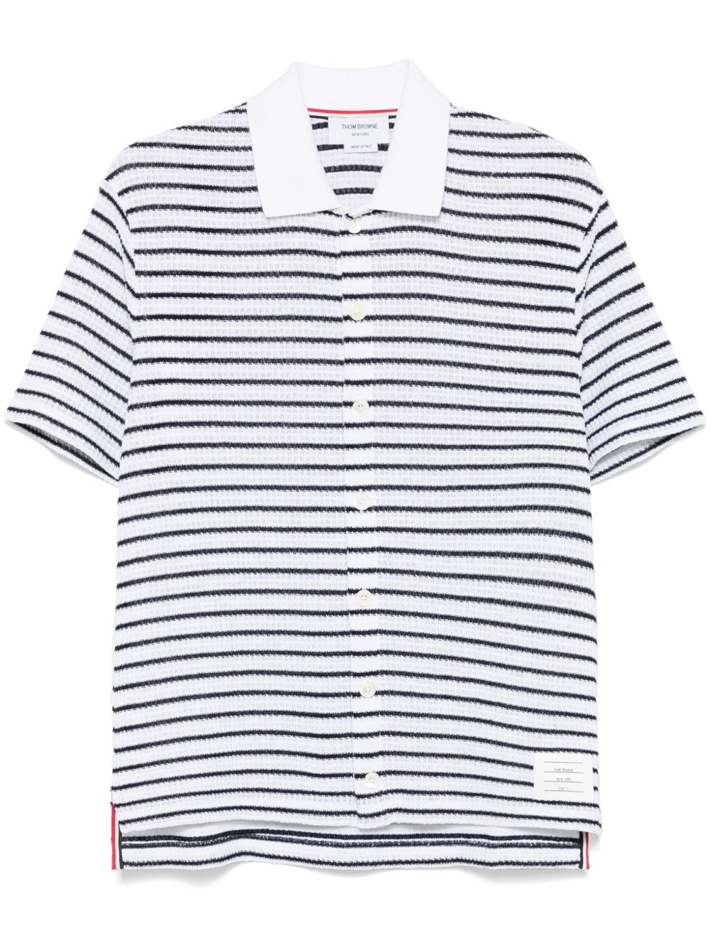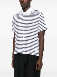 striped cotton shirt Highlights - Navy blue - Front button fastening - Short side slits - Short sleeves - Logo patch to the front Made in Italy Composition Cotton 100% SIZE & FIT Model measurements Height 6 ft 0 in(1.84 m) Bust/Chest 35.82 in(91 cm) Hips 37 in(94 cm) Waist 28.34 in(72 cm) Measurement CHEST 40.15 in(102 cm) SLEEVE LENGTH 18.11 in(46 cm) LENGTH 28.34 in(72 cm) Shoulder Width 16.92 in(43 cm) FittingInformation Designed for a regular fit, allowing for a comfortably loose fit throughout the body Made with a midweight knit, this piece offers some stretch