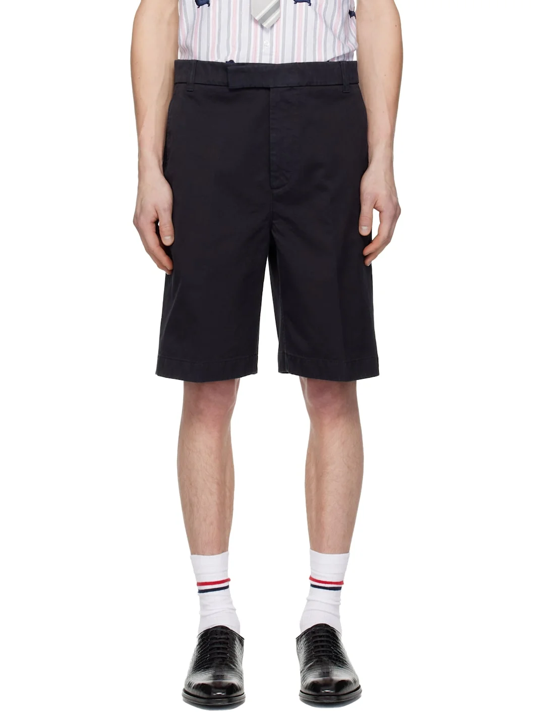 Cotton twill shorts. · Straight-fit · Belt loops · Zip fly · Four-pocket styling · Central crease at front and back legs · Tricolor grosgrain flag at back waistband Supplier color: Navy 100% cotton. Made in Italy 261381M193003